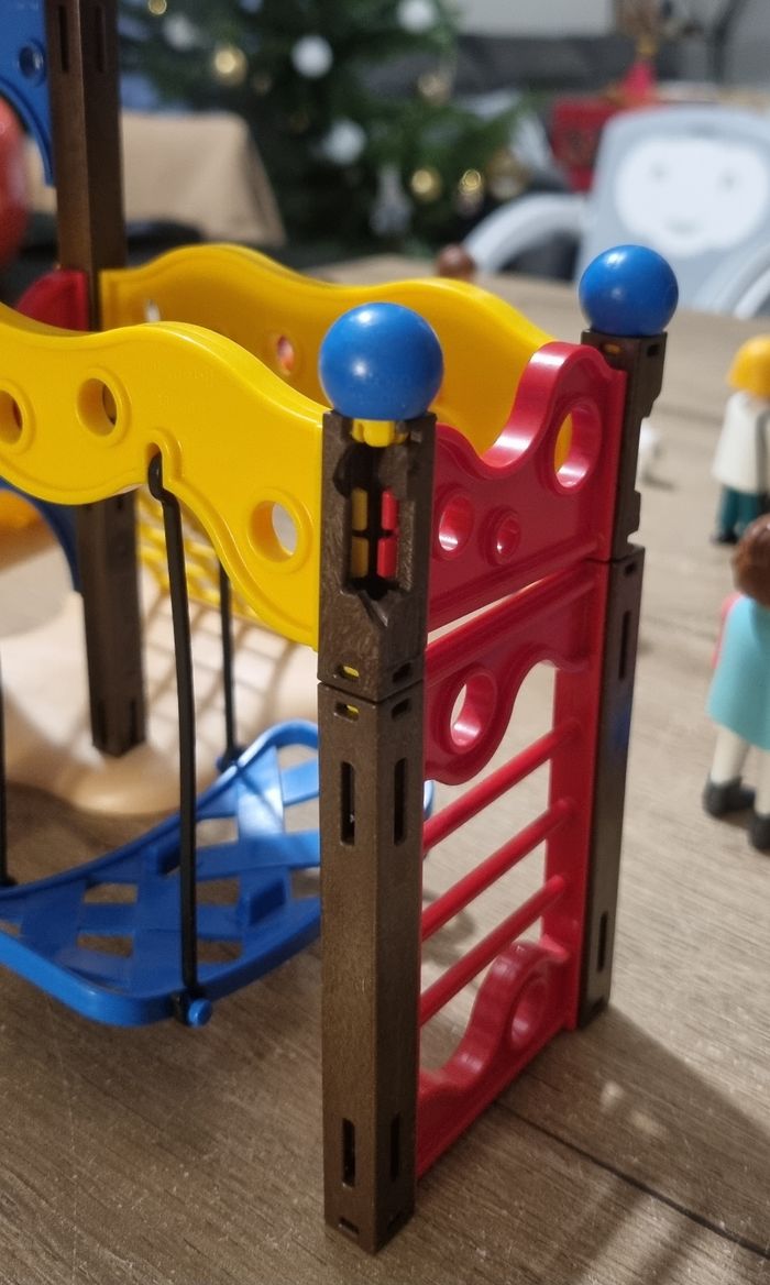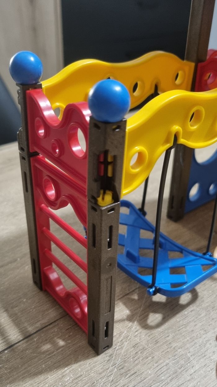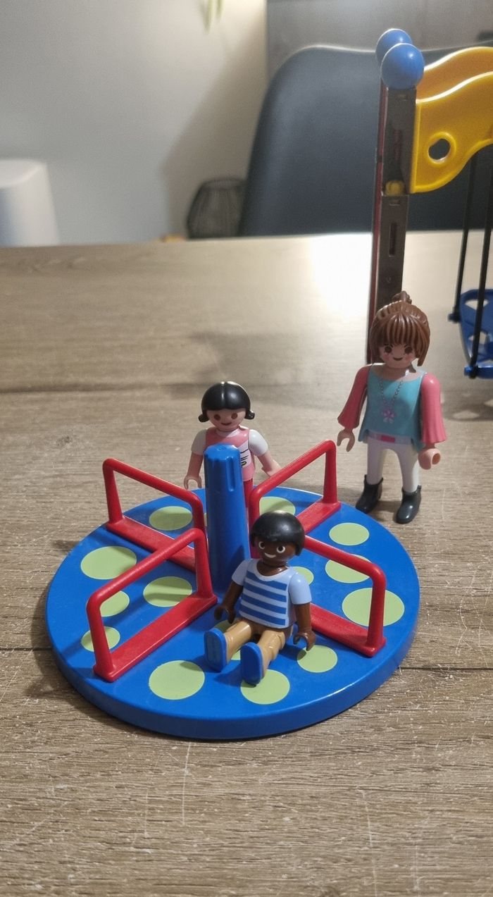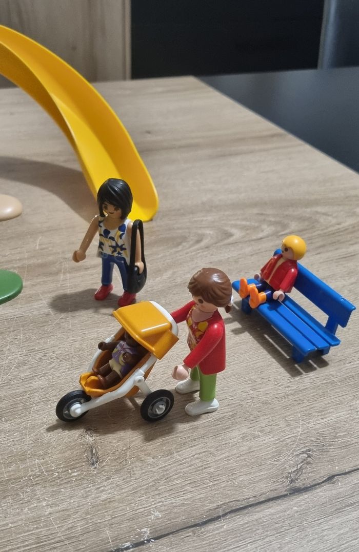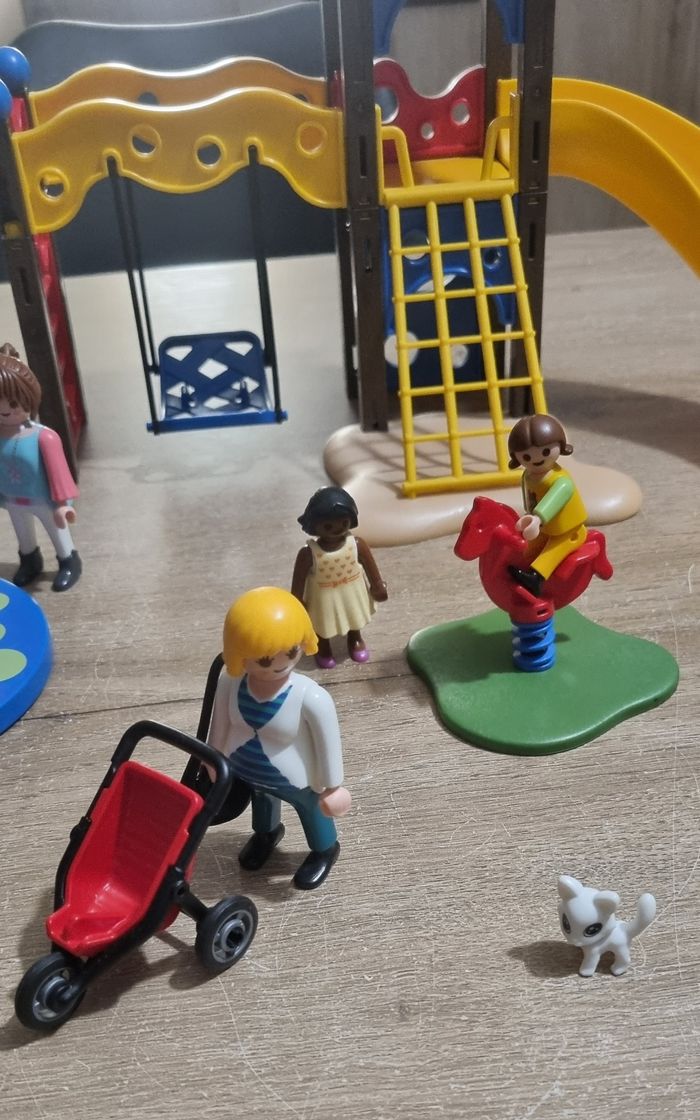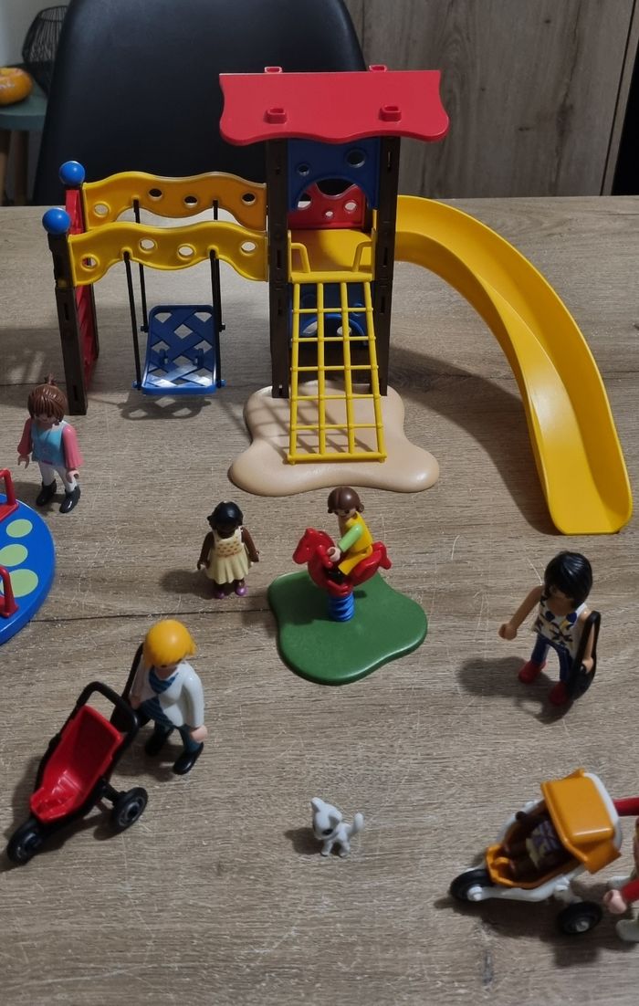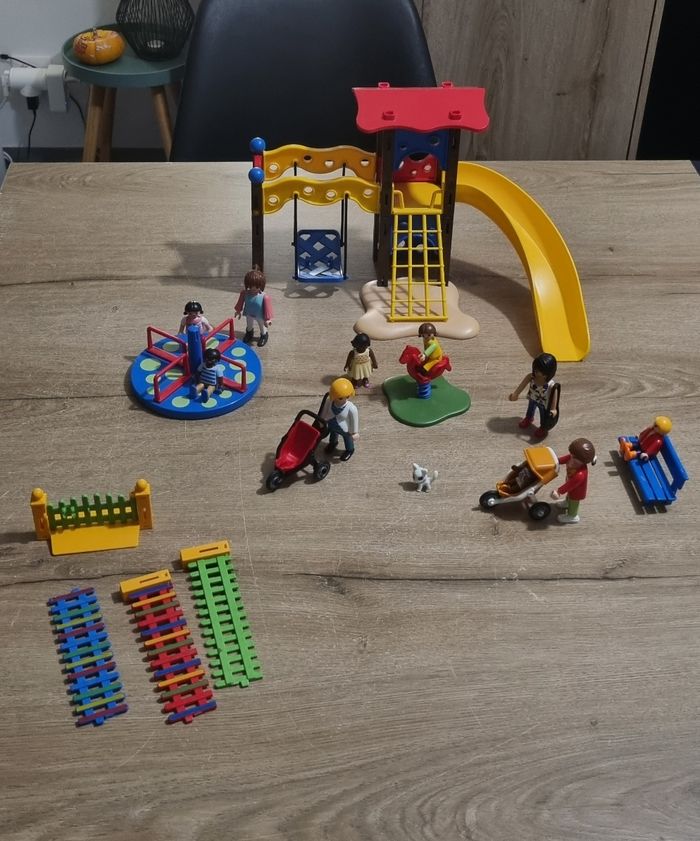 Playmobil City Life : Square pour enfant avec jeux n°5568 Bon état : 2 poteaux du jeu sont cassés mais n'empêche pas la fixation, et les fixations des barrières sont cassées et ne tiennent plus correctement (voir photos). Je mets donc plus de personnages en compensation (9 au lieu de 5 initialement)