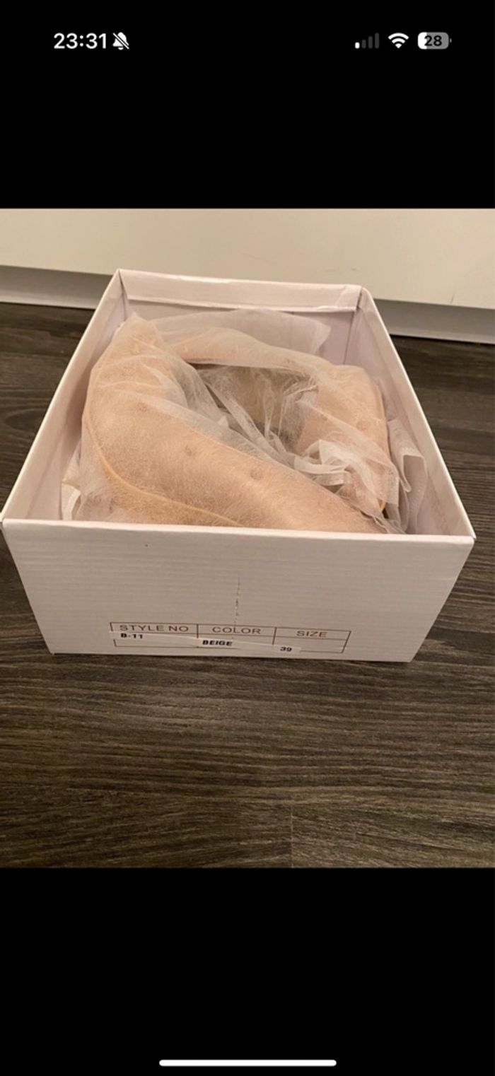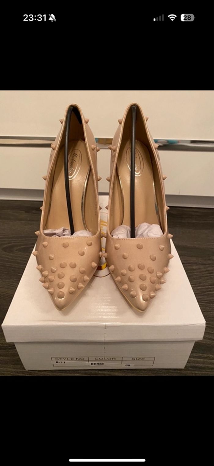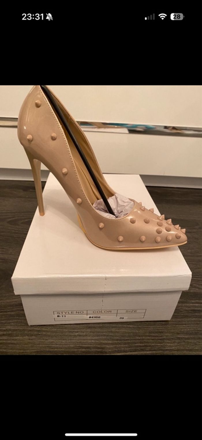 Escarpins beige/champagne cloutés neufs, vendus avec l’emballage d’origine. Parfaits pour une soirée, un événement ou pour sublimer une tenue chic. 👠 Pointure : 39 📏 Talon : 10 cm 🎨 Couleurs : beige/champagne 🧼 État : neuf 💸 Valeur boutique : 50 €