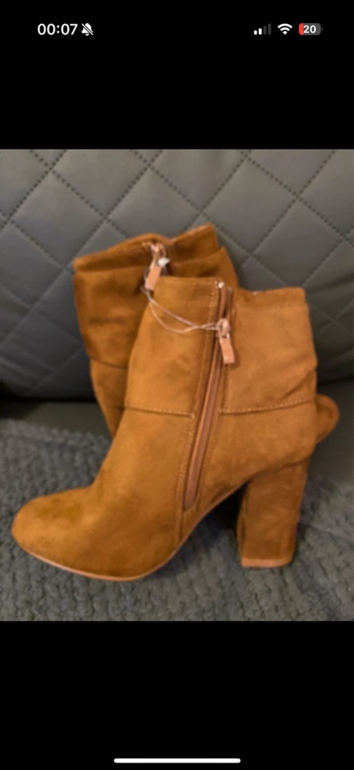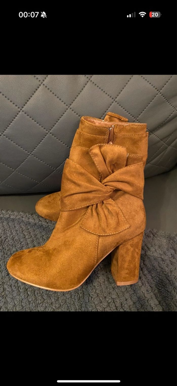 Bottines à talon Cache Cache neuves, elles offrent un style élégant et féminin, avec un joli nœud décoratif sur le côté. Parfaites pour l’automne, l’hiver ou pour compléter une tenue chic ! 🏷️ Marque : Cache Cache 👢 Pointure : 36 🆕 État : Neuf 🔒 Fermeture : Zip sur le côté pour un enfilage facile 🌸 Détail : Petit flot/nœud décoratif 🧵 Matière : Daim 🤎 Couleur : Marron camel