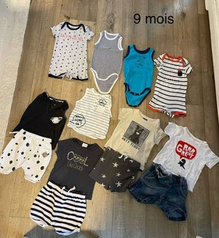 Bonjour, Je vends un lot de vêtements garçon 9 mois, de marque kiab, Zara. Composé de : 4 body manche courte 4 short 3 t-shirt 2 marcel
