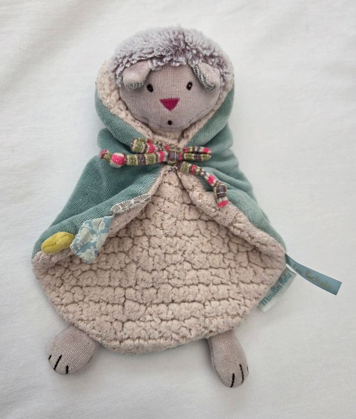 Doudou plat chat Les Pachats avec cape bleu vert- Moulin Roty