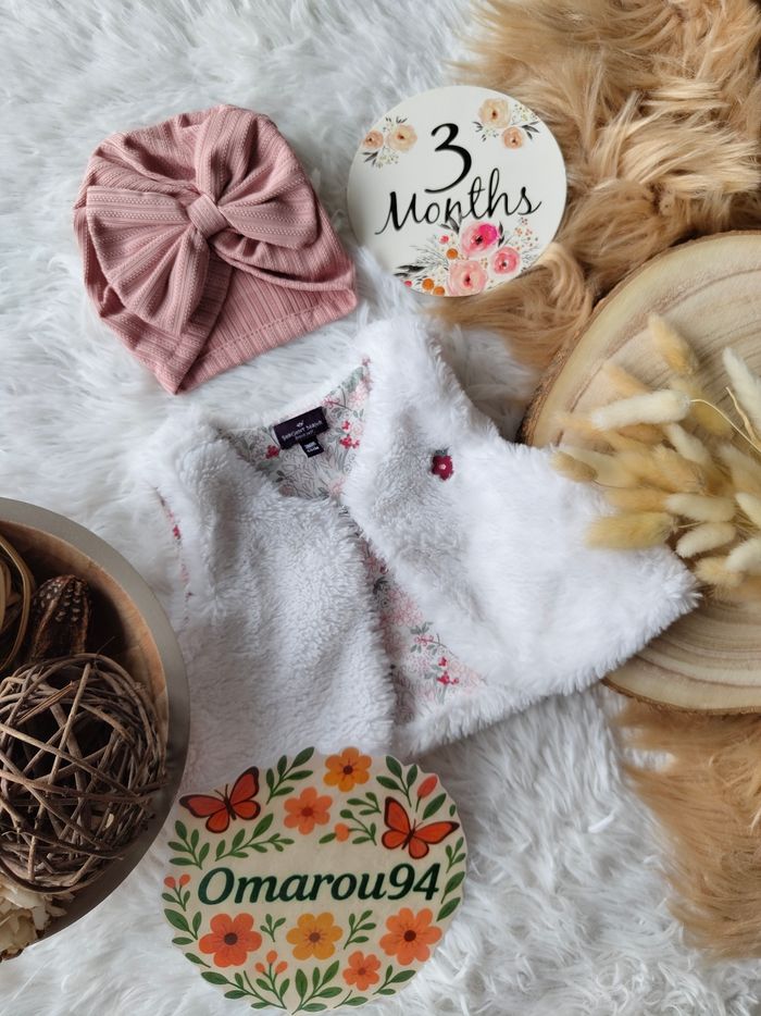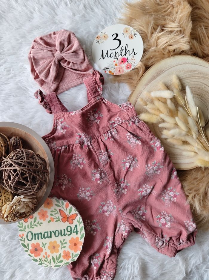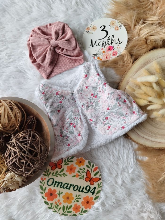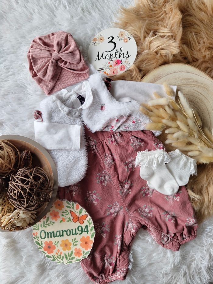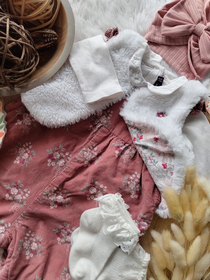 ✅ Excellent état ✅ Ensemble complet 5 pièces : gilet fourrure réversible fleuri+combinaison salopette velours fleurie+bodie manches longues ✅ Turban Neuf et chaussettes neuves 🌸 N'hésitez pas à vous abonner à mon dressing, mise en ligne régulièrement 🌸
