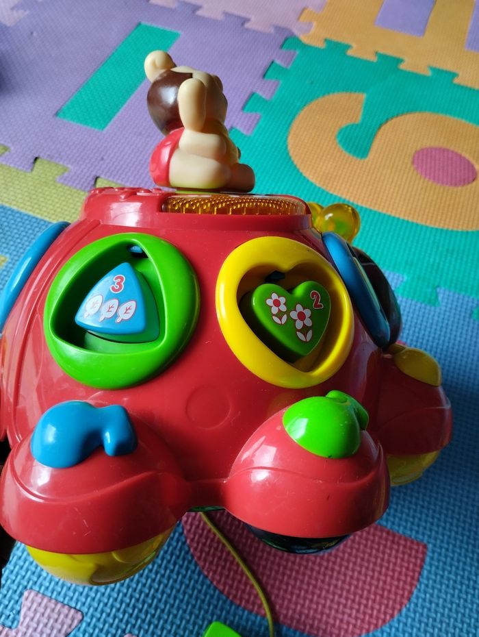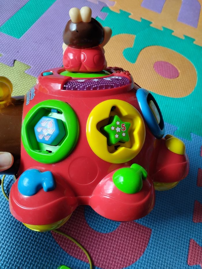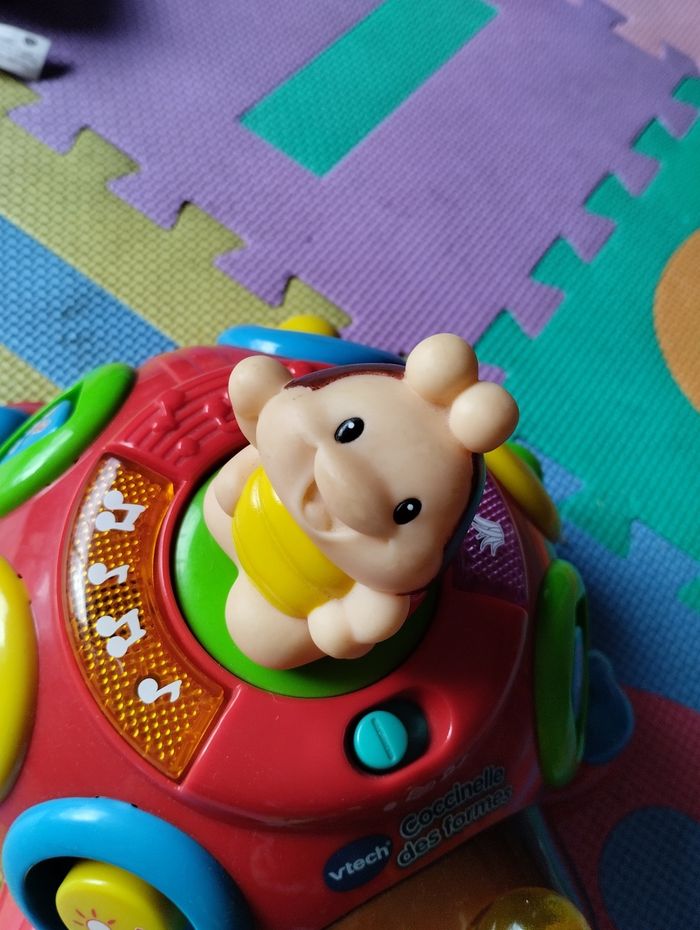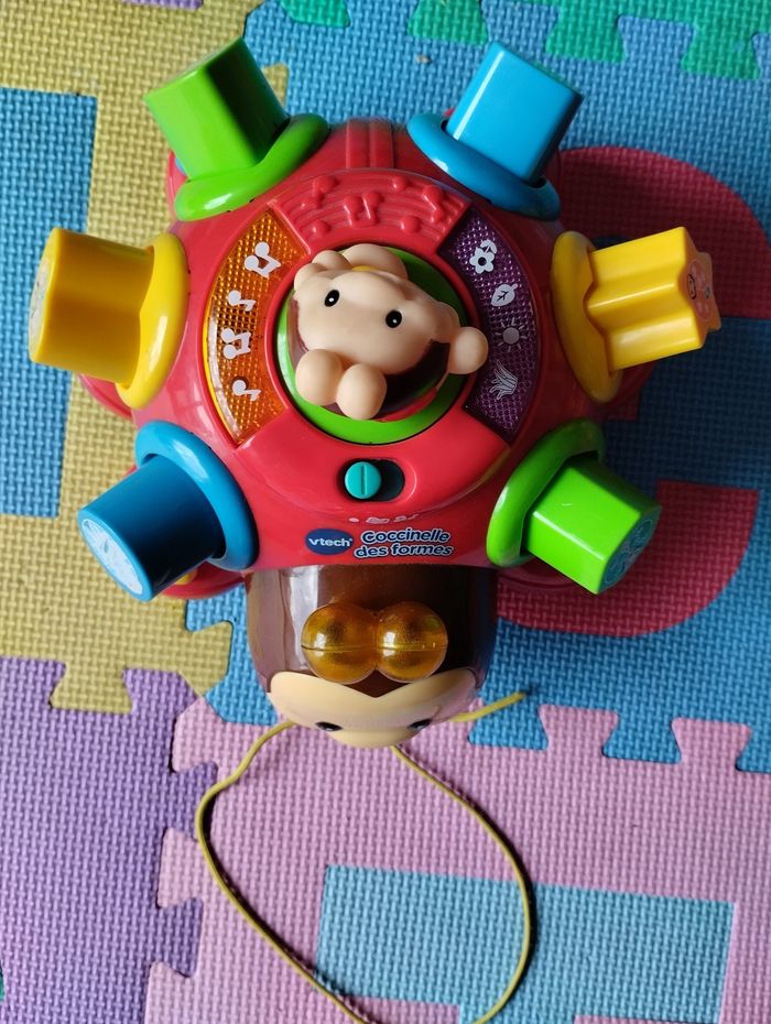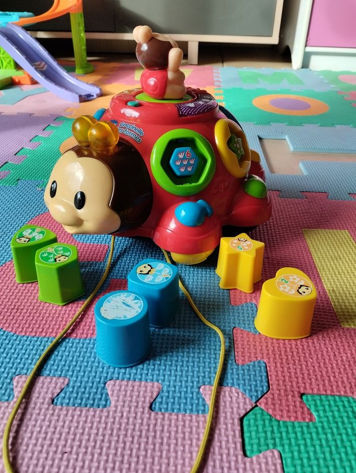 Coccinelle des formes de VTech. Fonctionne correctement. Jeu complet, très bon état général, sauf dessin du cercle et triangle qui sont un peu effacés, voir photo. Sons, lumières, jeu d'encastrement, jouet à tirer (la petite coccinelle du haut tourne quand on déplace la coccinelle).