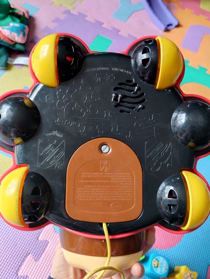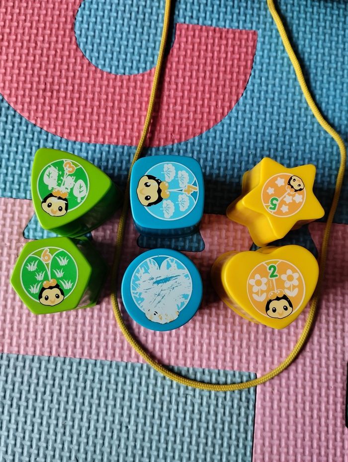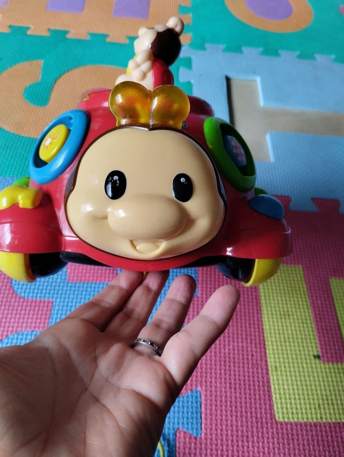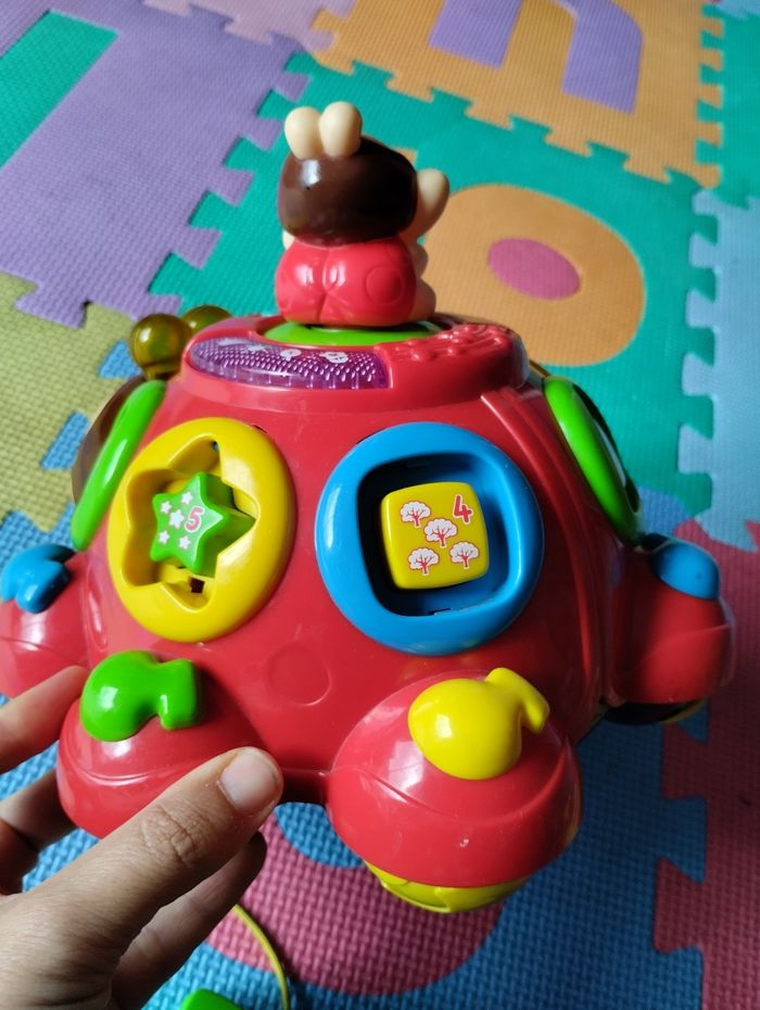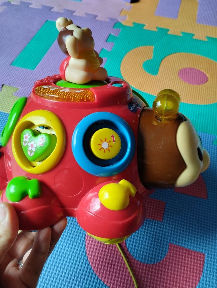 Coccinelle des formes de VTech. Fonctionne correctement. Jeu complet, très bon état général, sauf dessin du cercle et triangle qui sont un peu effacés, voir photo. Sons, lumières, jeu d'encastrement, jouet à tirer (la petite coccinelle du haut tourne quand on déplace la coccinelle).