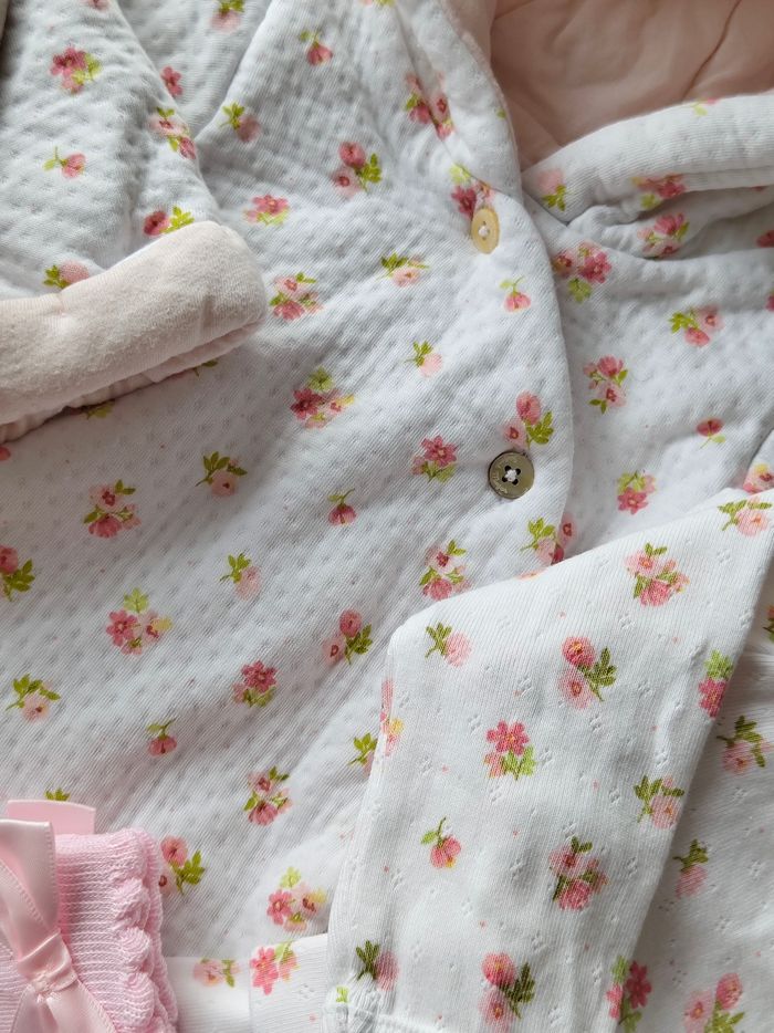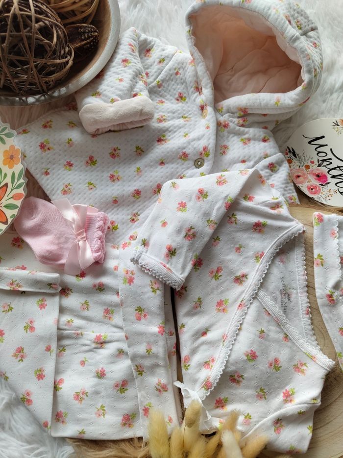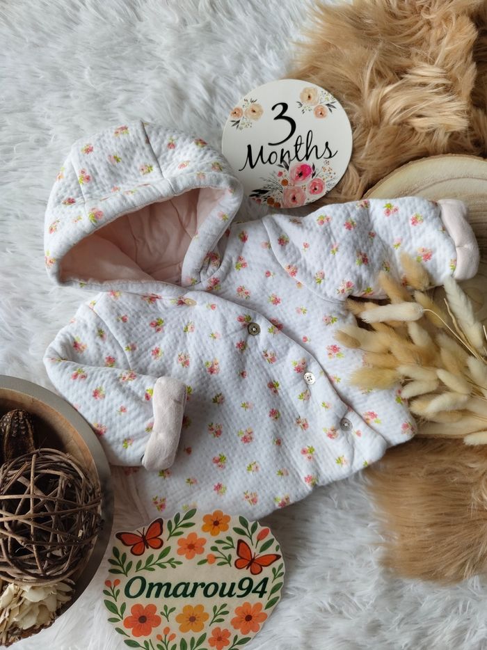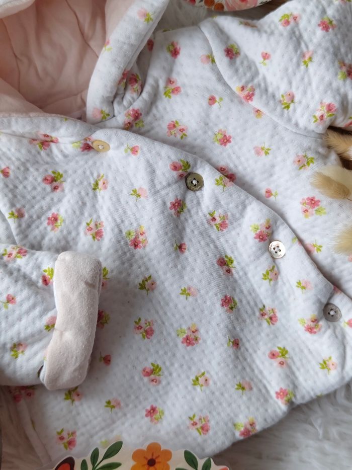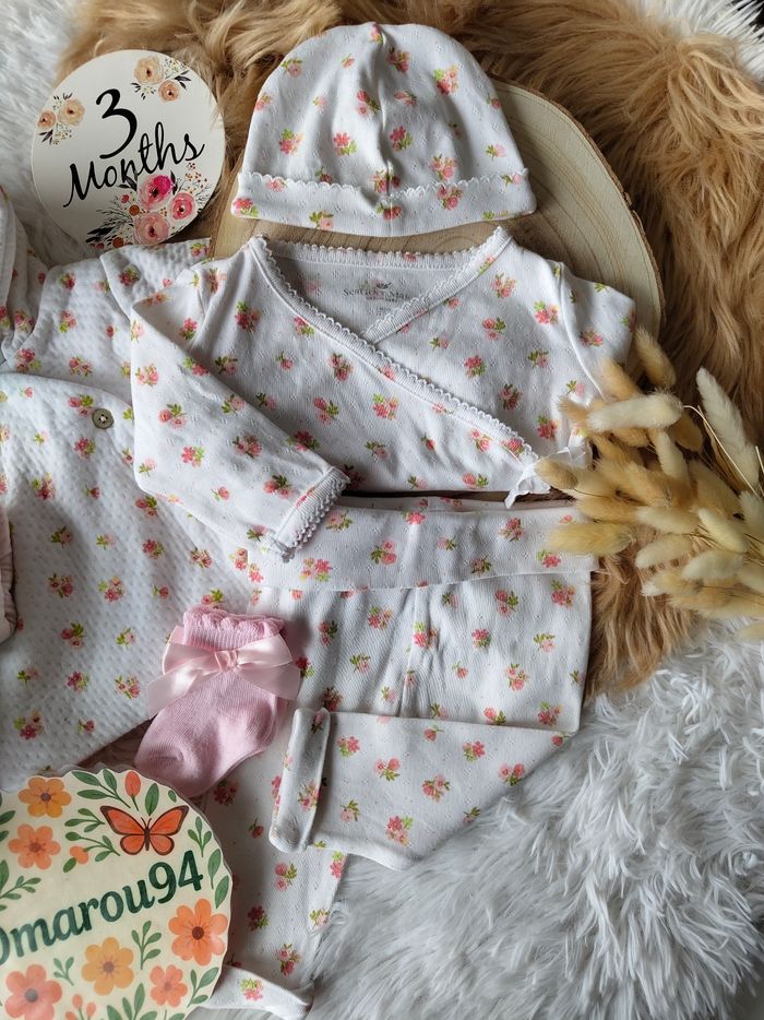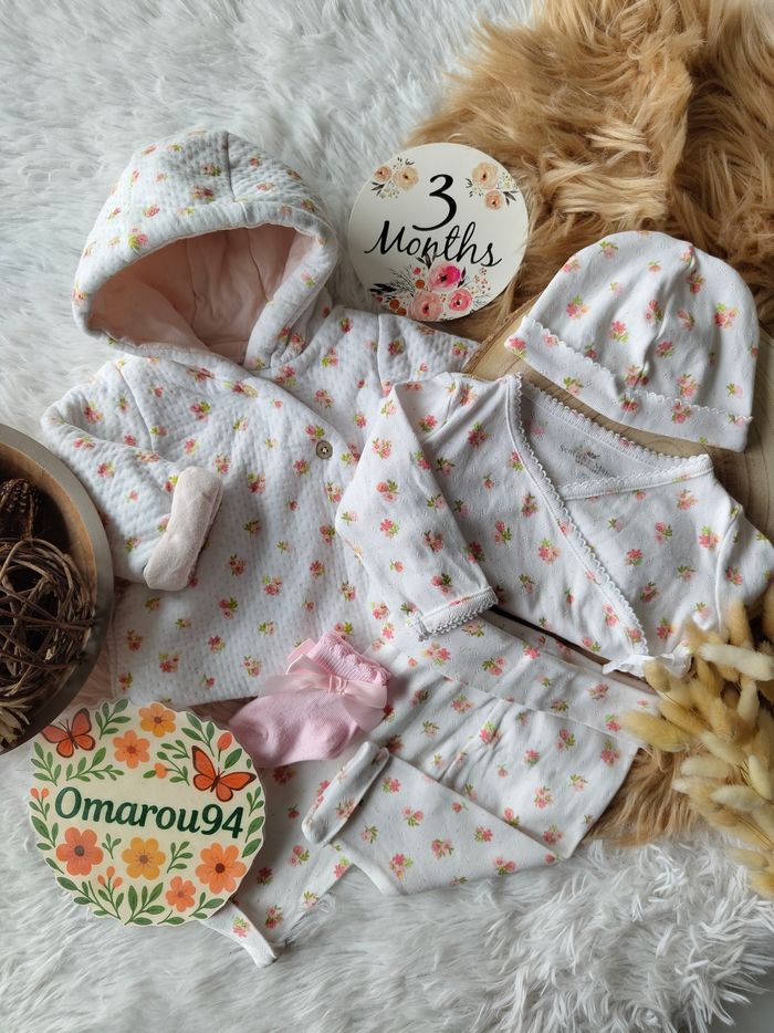✅ Excellent état ✅ Manteau molleton fleuri+ ensemble en maille ajourée fleuri 3 pièces collection "naissance" et son bonnet turban fleuri ✅ Chaussettes neuves 🌸 N'hésitez pas à vous abonner à mon dressing, mise en ligne régulièrement 🌸