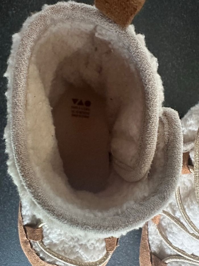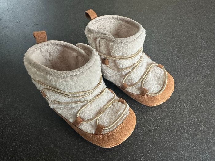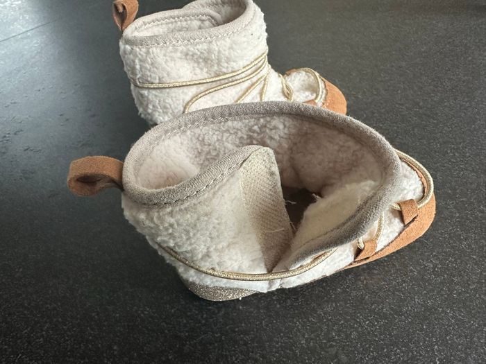 🎨 Coloris beige 📏 Taille 12-18 mois 🏷️ Neuves, jamais portées 🧵 Matière sherpa douce ✨ Détails dorés sur le talon et les lacets 🤎 Semelle anti-dérapante en cuir suédé Ces bottes en sherpa beige sont parfaits pour garder les petits pieds bien au chaud! Inspirés d'un style cocooning, ils offrent confort et douceur grâce à leur matière moelleuse et leurs détails en partie en cuir suédé. Faciles à enfiler, ils bénéficient d'une semelle antidérapante pour plus de sécurité. Leur design tendance et leurs finitions délicates ajoutent une touche de charme aux tenues des tout-petits.