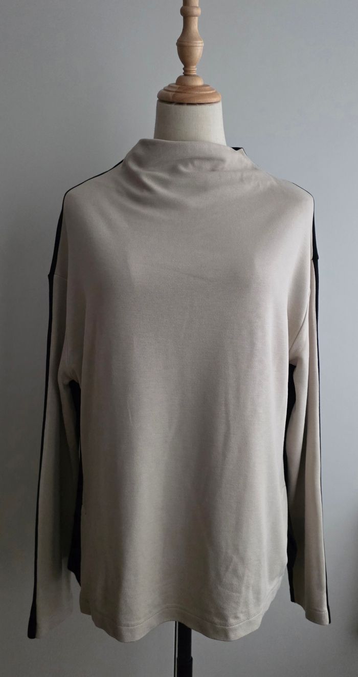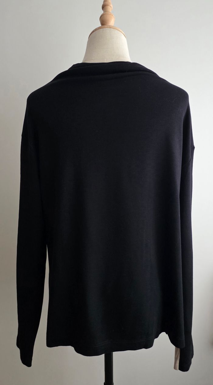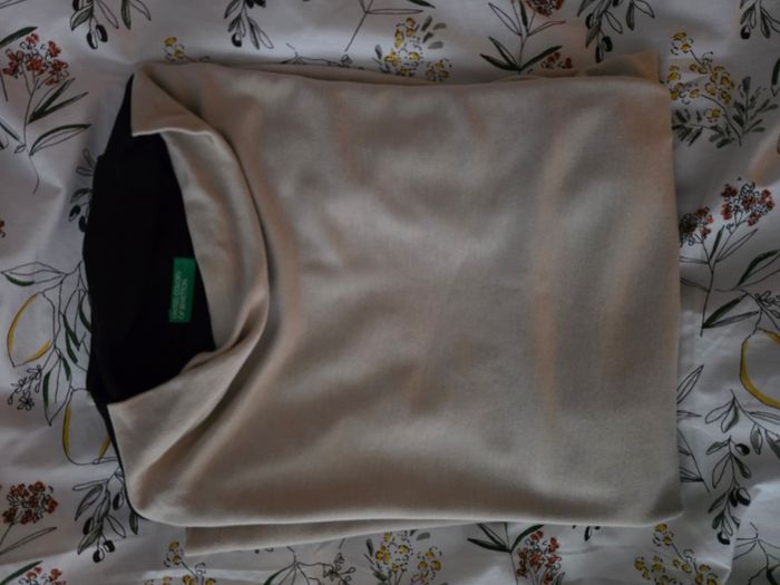 Pull de marque Benetton, taille L, 87% viscose, 10% polyester, 3% élasthanne. Devant de couleur crème, dos de couleur noir.