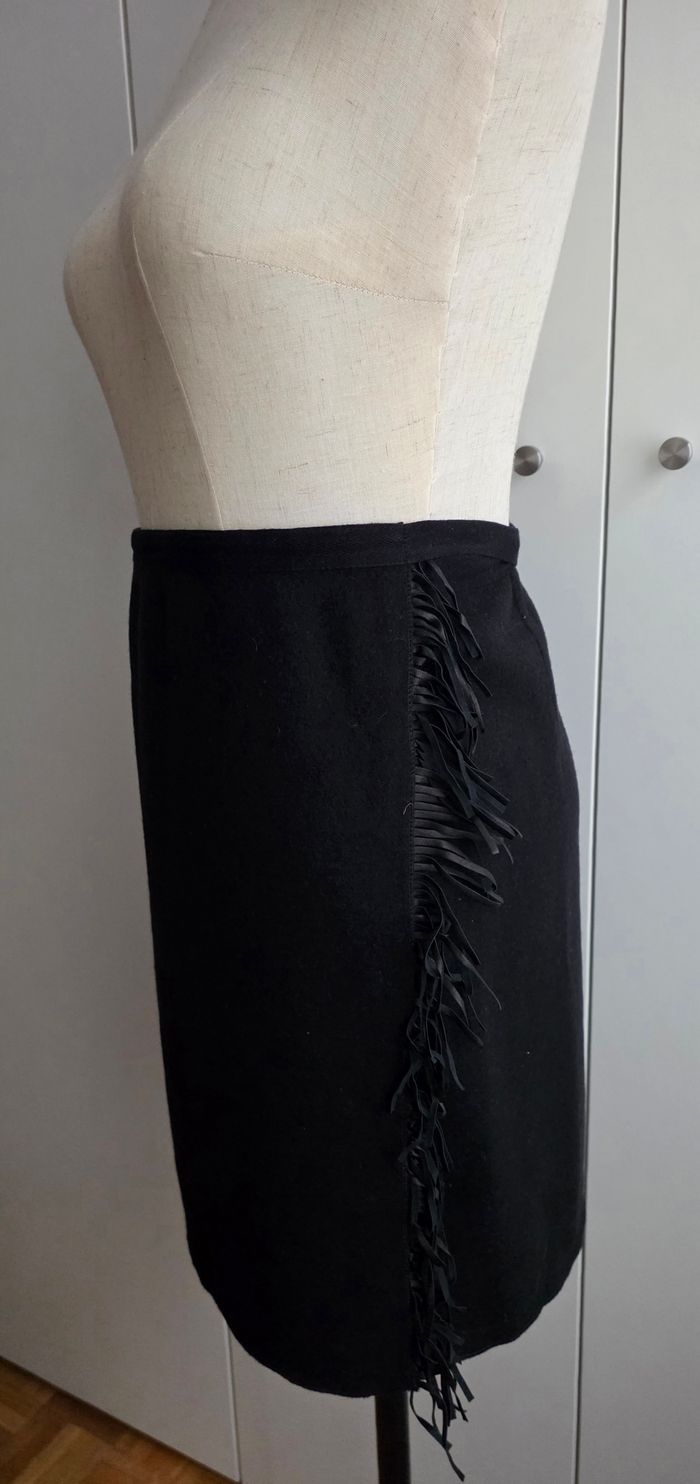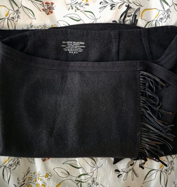 Jupe de marque Majestic Filatures, taille 1, 100% merinos, intérieur 100% coton, déco lanière 100% cuir. Couleur noir, forme portefeuille. Longueur: 47.5cm