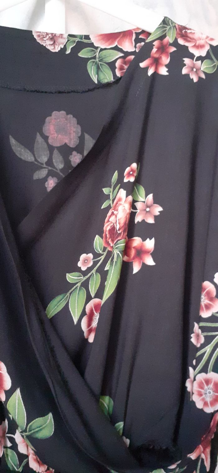Vends une robe manches longues avec élastique aux poignets, en viscose et polyester, non doublée mais pas transparente, élastique à la taille avec passants et ceinture assortie, croisée sur le buste, couleur noir avec fleurs roses et vertes, taille 42-44. Longueur dans le dos : 139 cm Largeur aisselle à aisselle : 50 Largeur de la ceinture à plat : 31 à 45 cm Largeur au niveau des hanches : 67 cm.