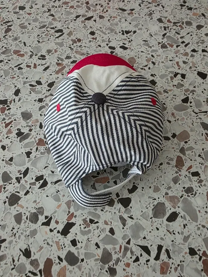 Casquette de marque Petit Bateau, taille 3/6 mois, 100% coton. Dans les tons bleu / blanc / rouge. Scratch à l'arrière.