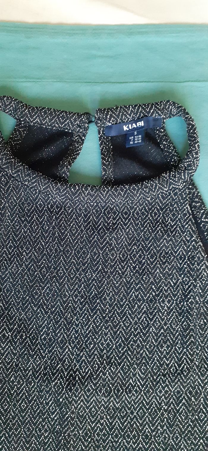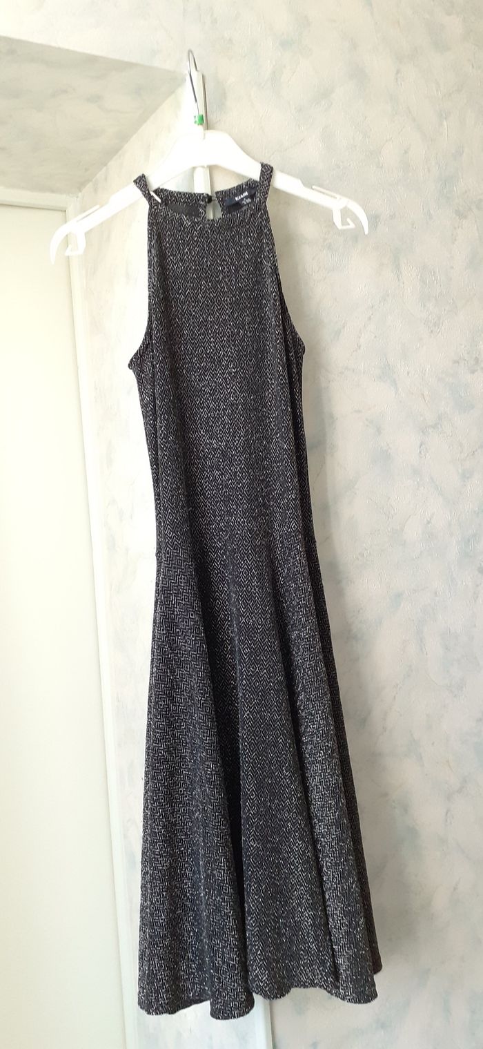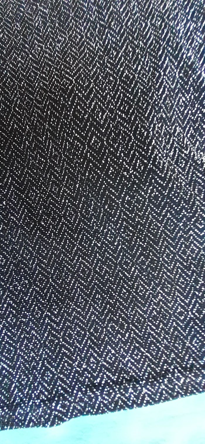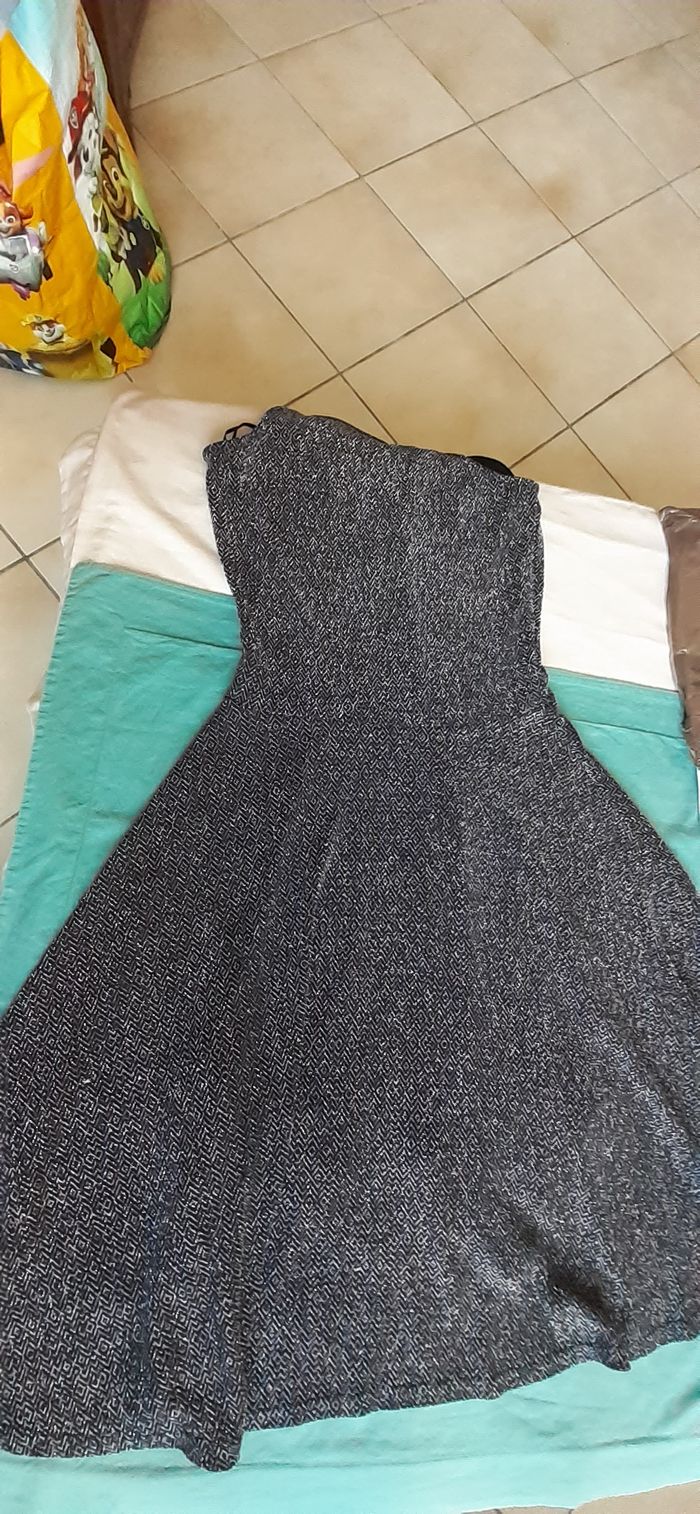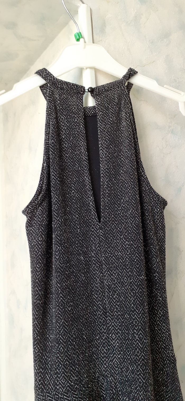 Vends une robe de fête étroite sans manche, fendue sur le haut du dos, 86 % polyamide, 10 % métal, évasée à partir de la taille, tissu lourd et fluide, couleur noir avec motifs argentés en chevrons, marque Kiabi, taille 34-36.