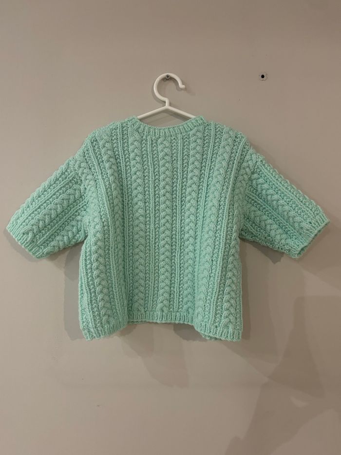 Magnifique gilet en tricot couleur menthe, fait main, très doux et confortable. Détails en torsades + beaux boutons en bois. Coupe légèrement oversize avec manches courtes.