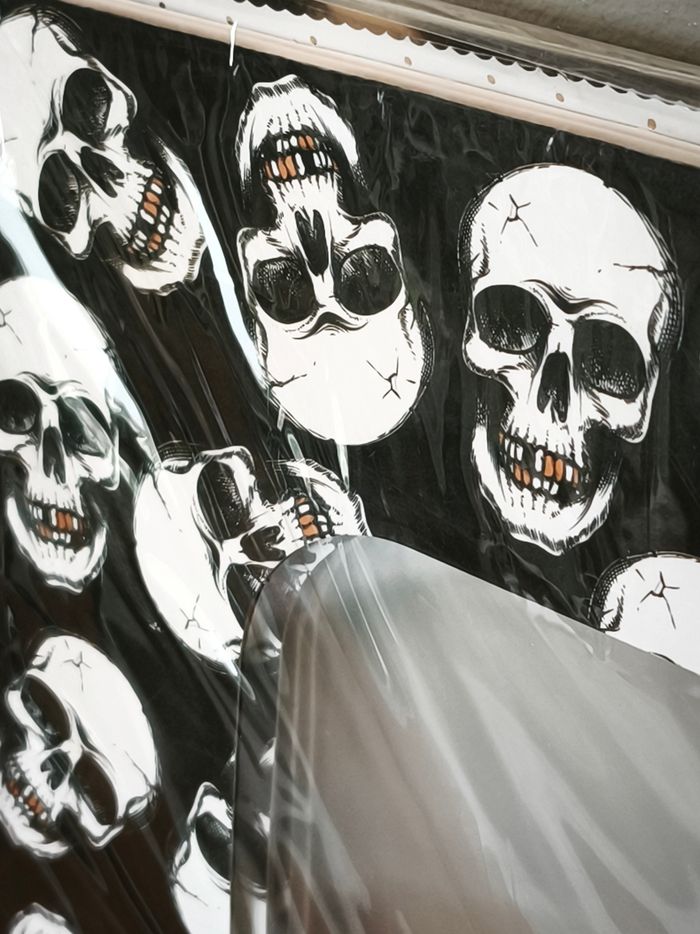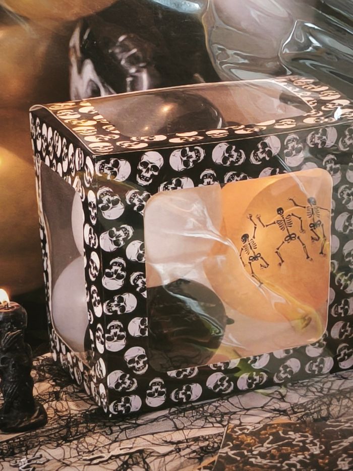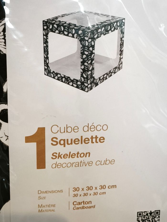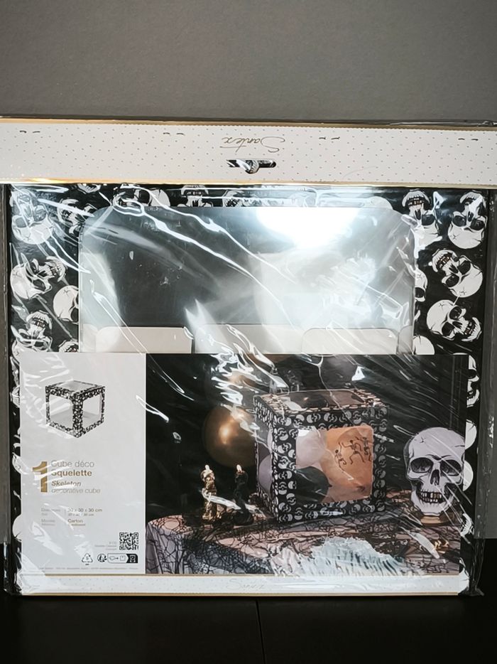 NEUF Cube décoratif squelette en carton de la marque SANTEX. Il est conçu pour être monté et utilisé comme élément de décoration central, éventuellement pour y placer des ballons, des petits objets thématiques ou des friandises, comme on peut le voir sur l'image d'exemple.