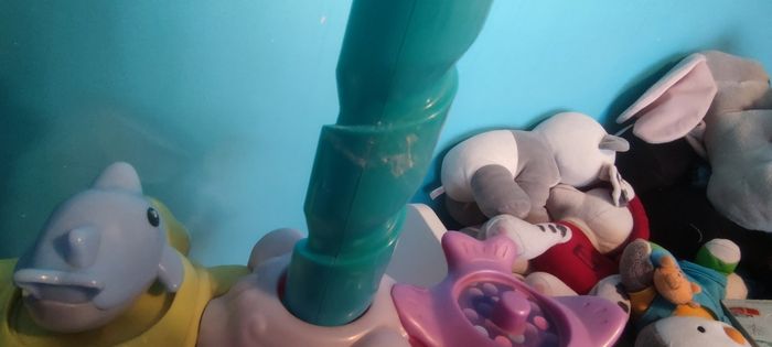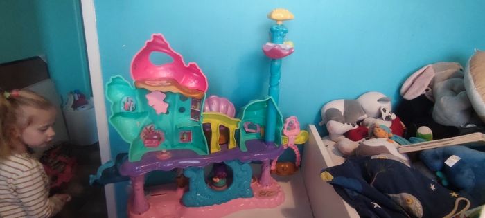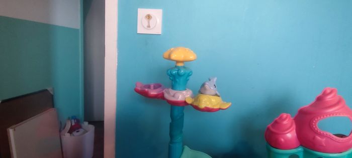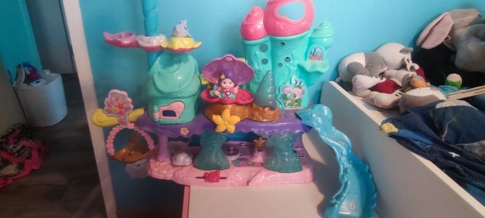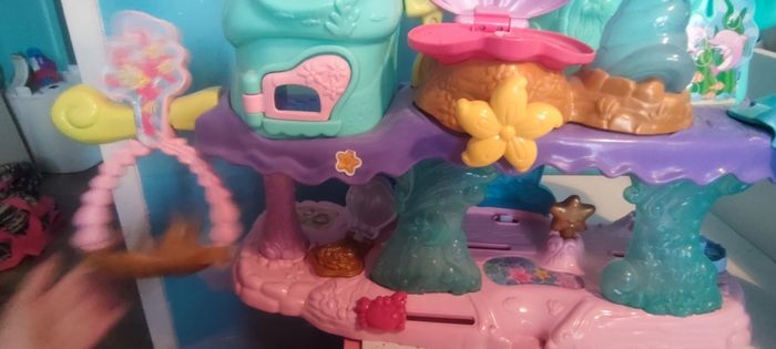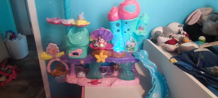 Château enchanté sirène vendu avec la sirène et un dauphin dès compose la sirène le château s'illumine la sirène chante. La spirale a été réparée et fonctionne. Il manque en bas juste une algue sinon dans l'ensemble il n'est pas abîmé.