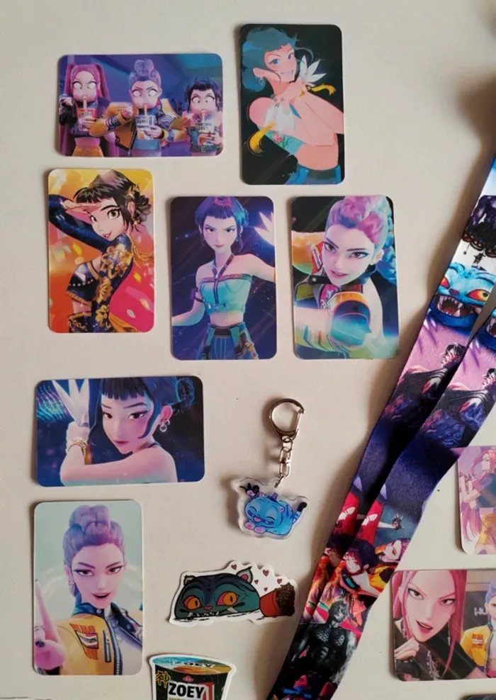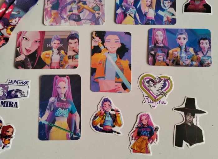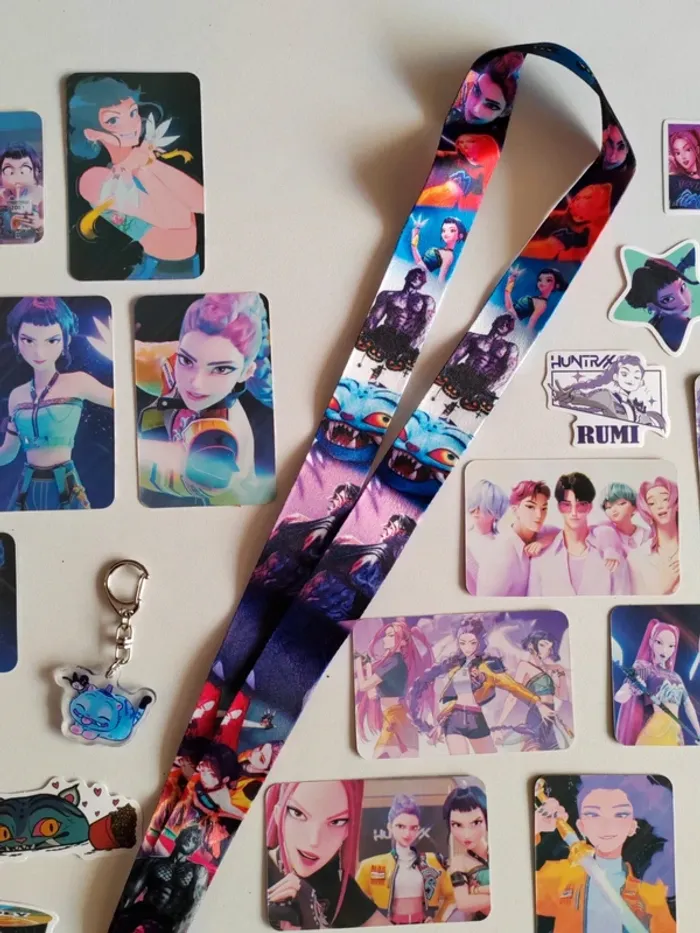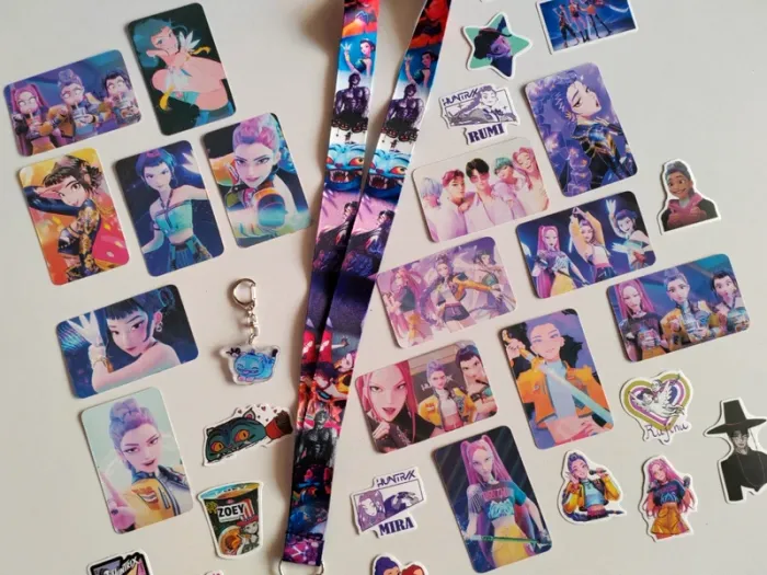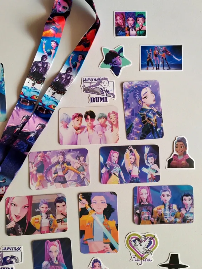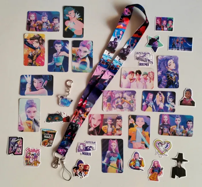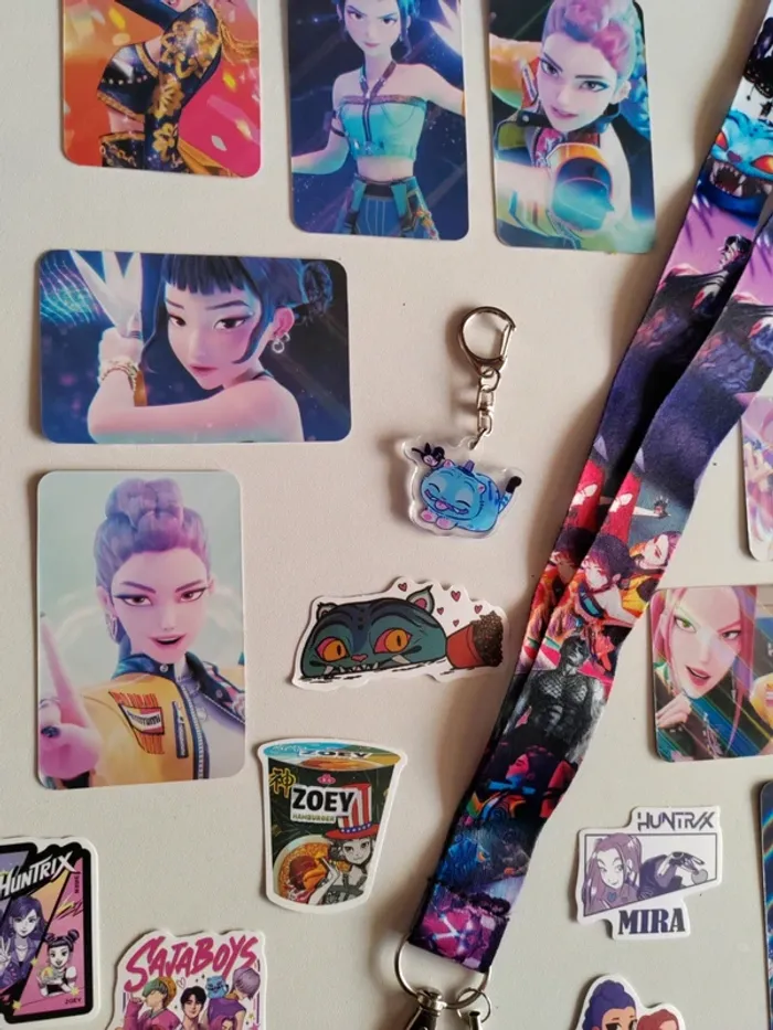 Lot Huntrix, K-pop demon hunters / Stickers, carte brillantes + porte clé + tour de cou, badge..