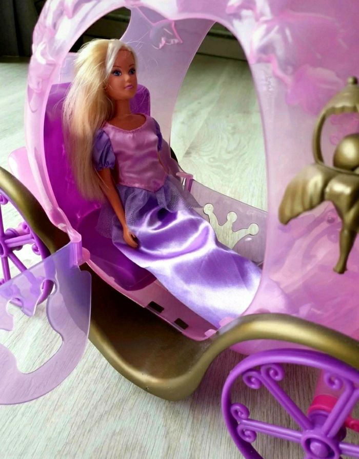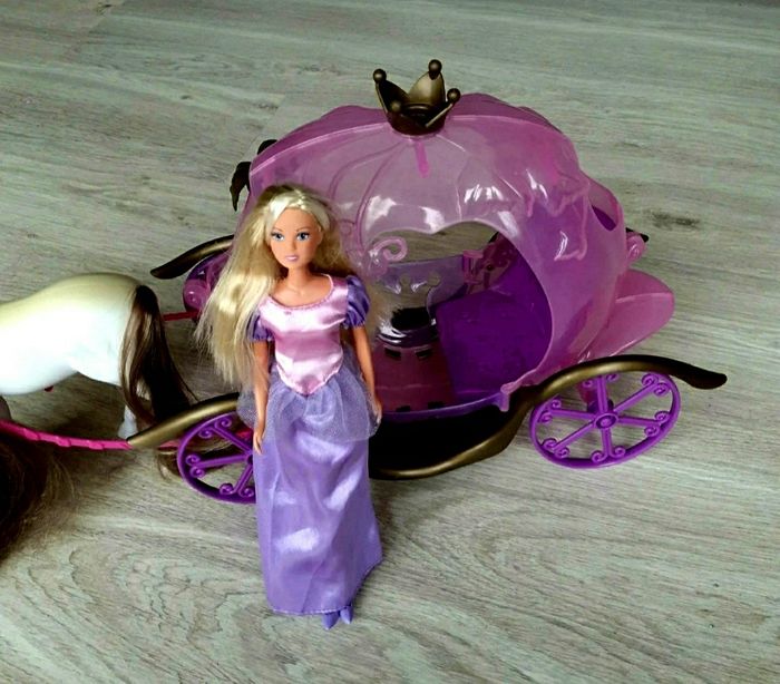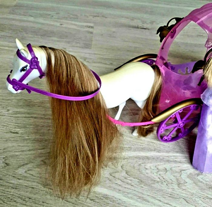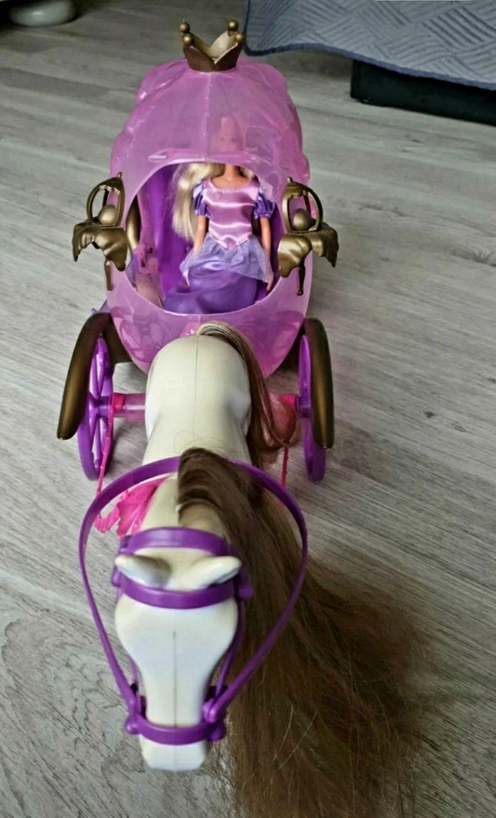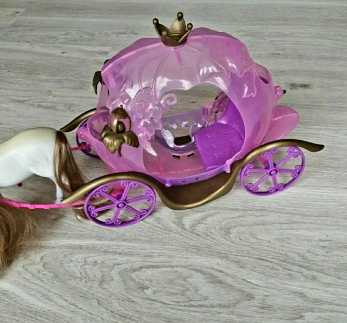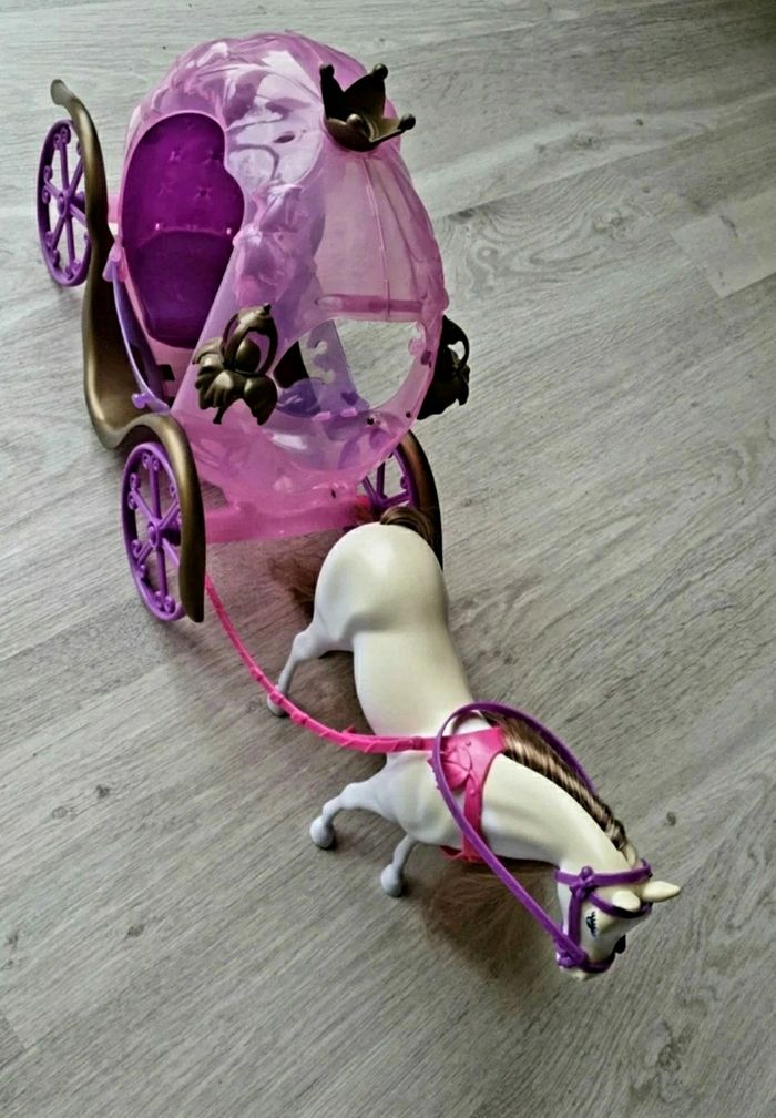 Carrosse avec son cheval. Poupée en tenu de princesse incluse. Le dessus du cheval et jauni (voir photo).