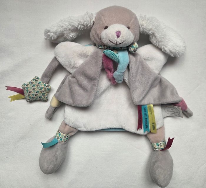 Doudou et compagnie marionnette Toopi le chien en velours de couleur blanc et de l'autre côté en velours de couleur bleu turquoise . Cape en velours de couleur grise . Echarpe en tissu avec motifs autour de son cou. Attaché à sa main , une étoile avec bruit de papier froissé. Étiquettes rubans .