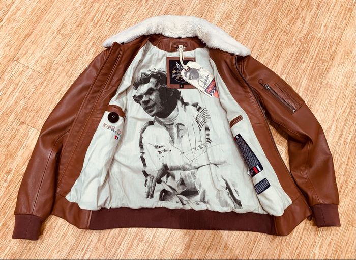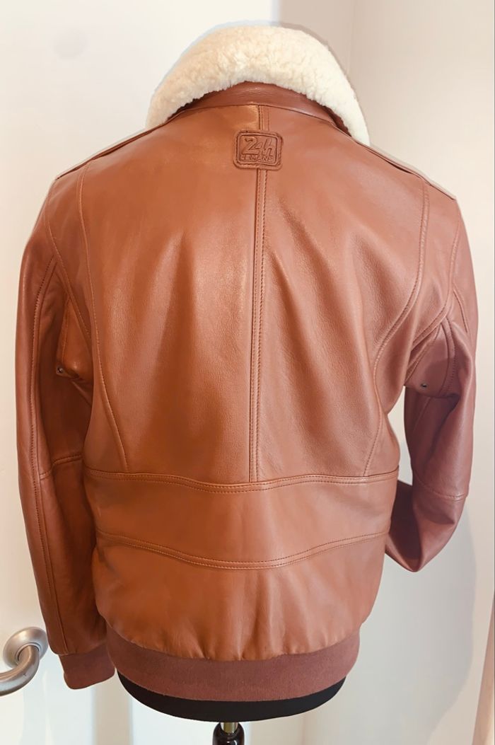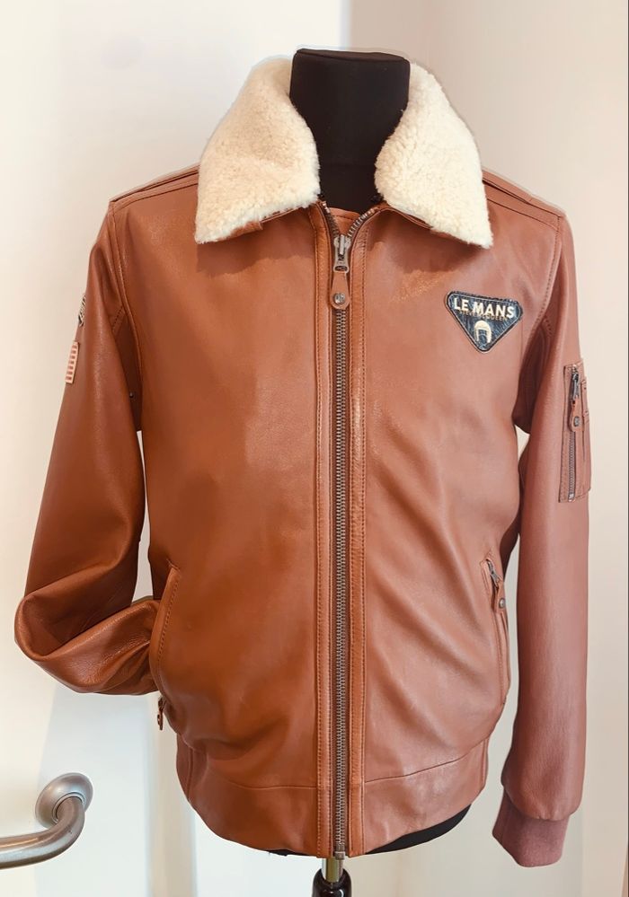Blouson en cuir d’agneau avec tannage végétal de la marque allemande 🇩🇪 Mainpol, série Steve Mc Queen les 24 heures du Mans 1971, 2 poches zippées extérieurs, 2 poches intérieurs, 1 poche zippée sur le bras gauche, col fourrure mouton amovible, neuve avec étiquette, vendue en magasin 569 €