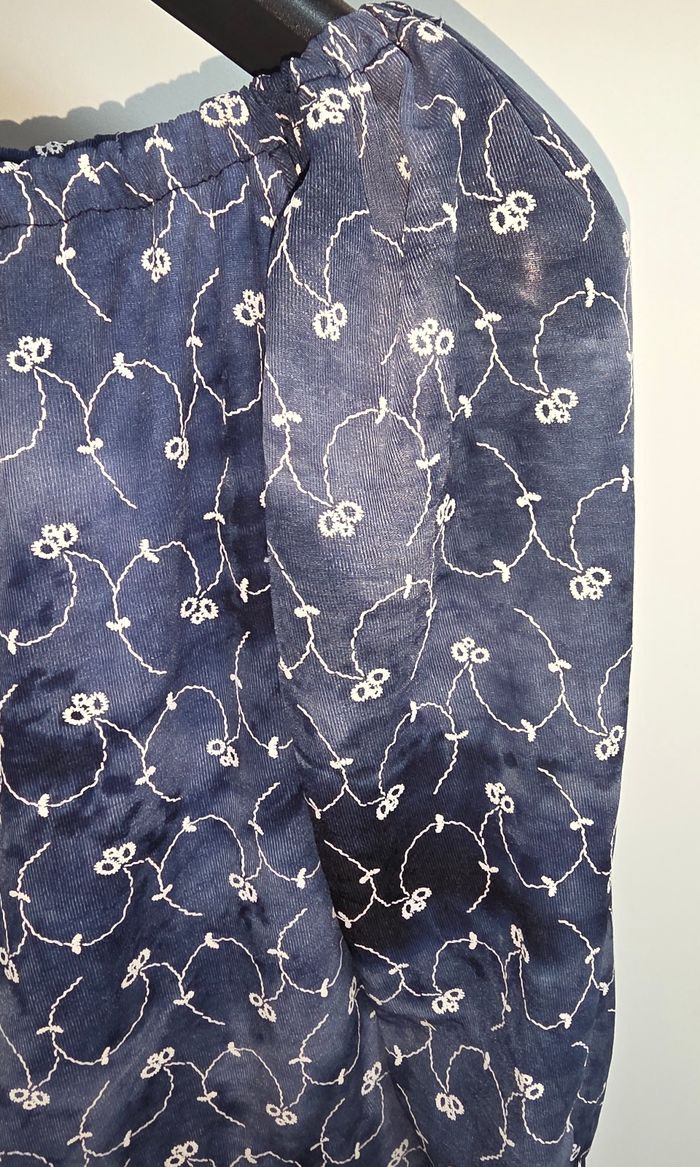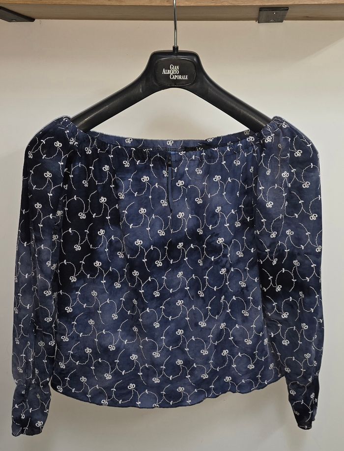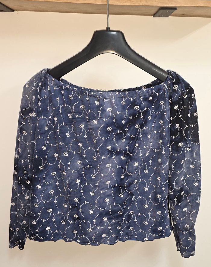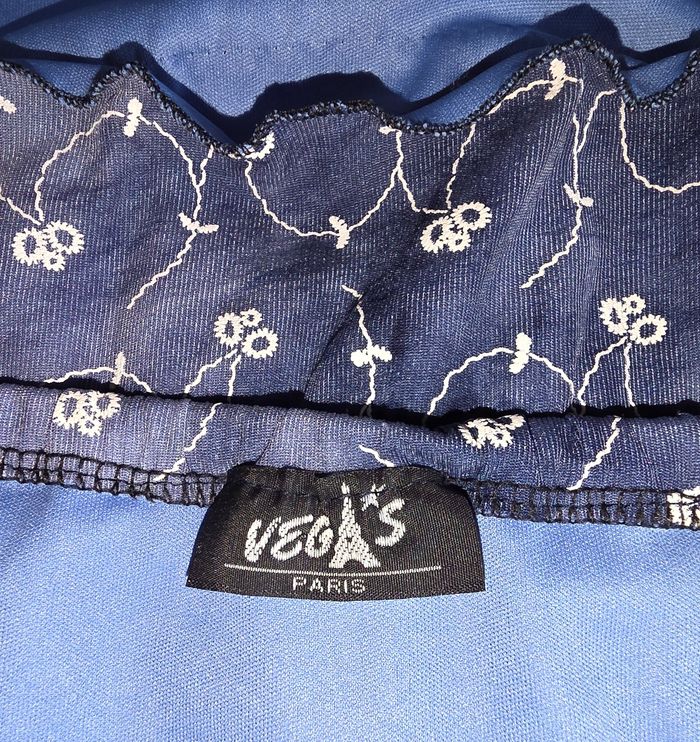 Tee-shirt a manche longue. Épaules dénudées de couleurs bleu. Manches légèrement transparentes. Marque vegas paris, pas de taille indiqué, correspond a un M.