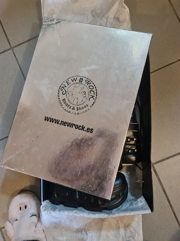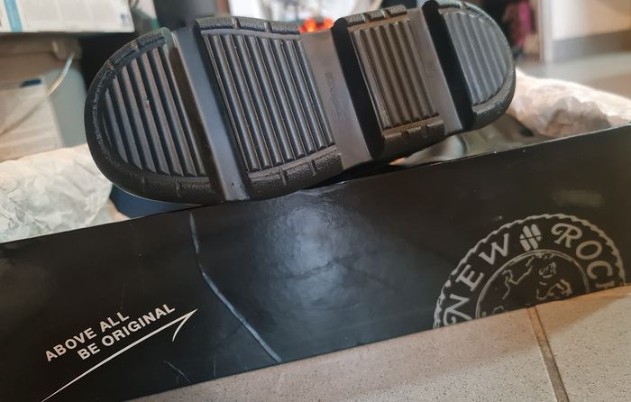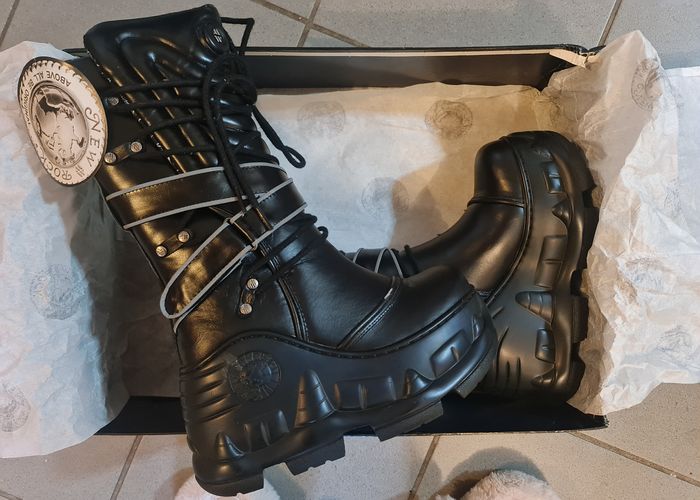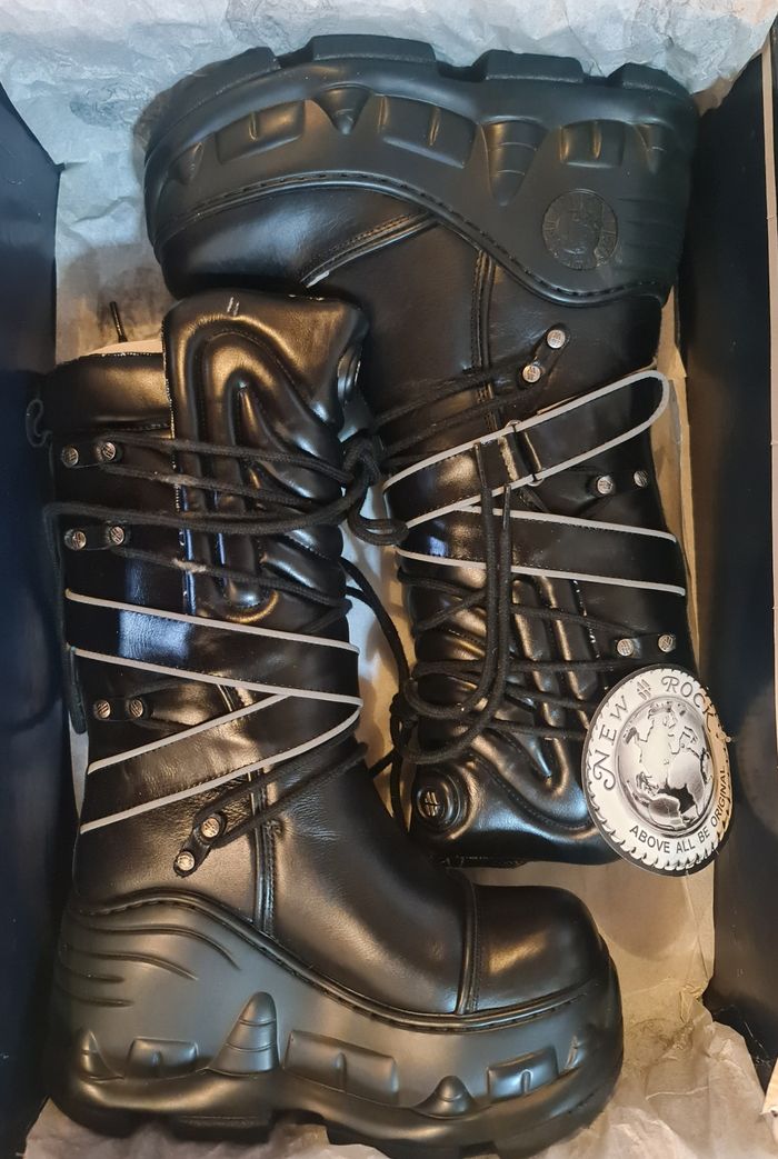 Dans sa boîte d'origine bottes New Rock 36 neuves authentiques avec étiquette, cuir et métal avec boucles, compensées épaisses, lacets et brides velcro. Ces bottes compensées montent au dessus de la cheville. Celles ci restent confortables et pratiques