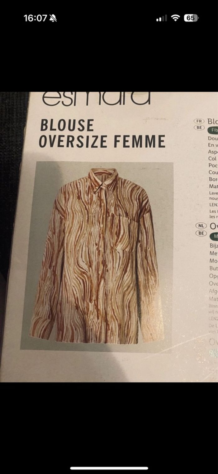 Chemise oversize ESMARA, tendance, confortable et facile à porter. Parfaite pour un look casual ou chic 😍 🧥 Marque : ESMARA 📏 Taille : 38 🌟 État : Neuf 👗 Coupe : Oversize 🧵 Détails : Boutonnée sur toute la longueur 🎨 Couleur : Beige et marron à motifs