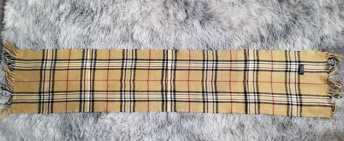 Écharpe Burberrys vintage authentique, ornée du célèbre motif écossais Nova Check en tons beige/camel, avec touches noires, blanches et rouges.