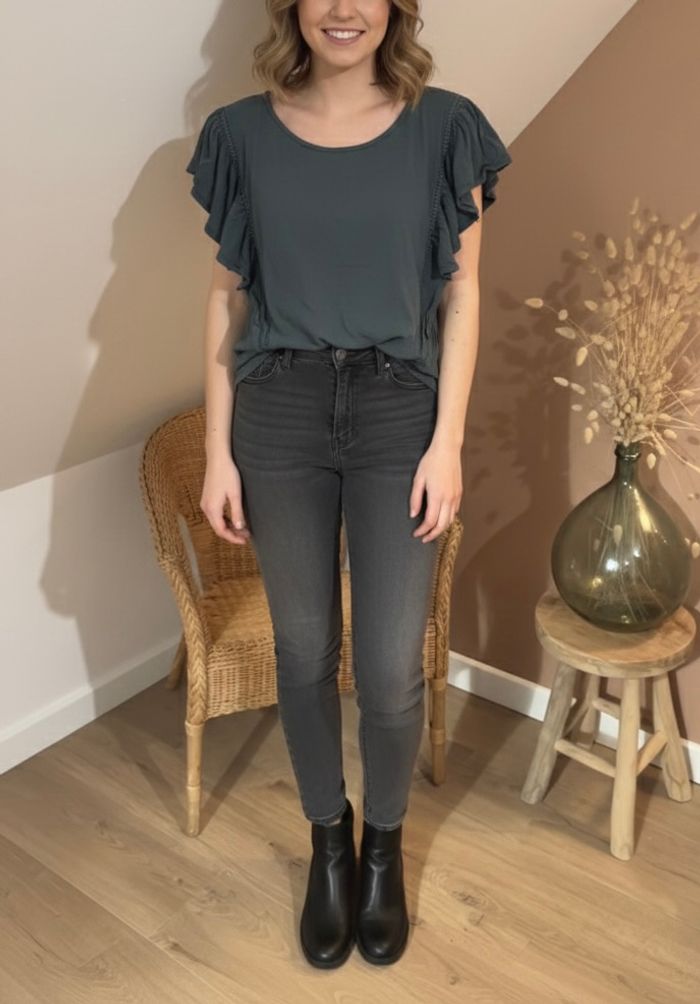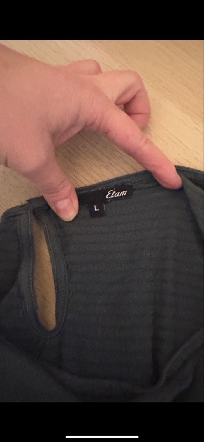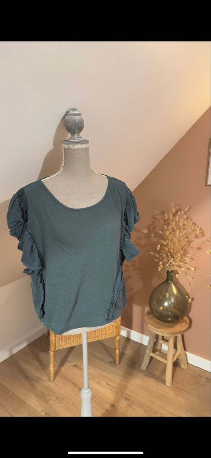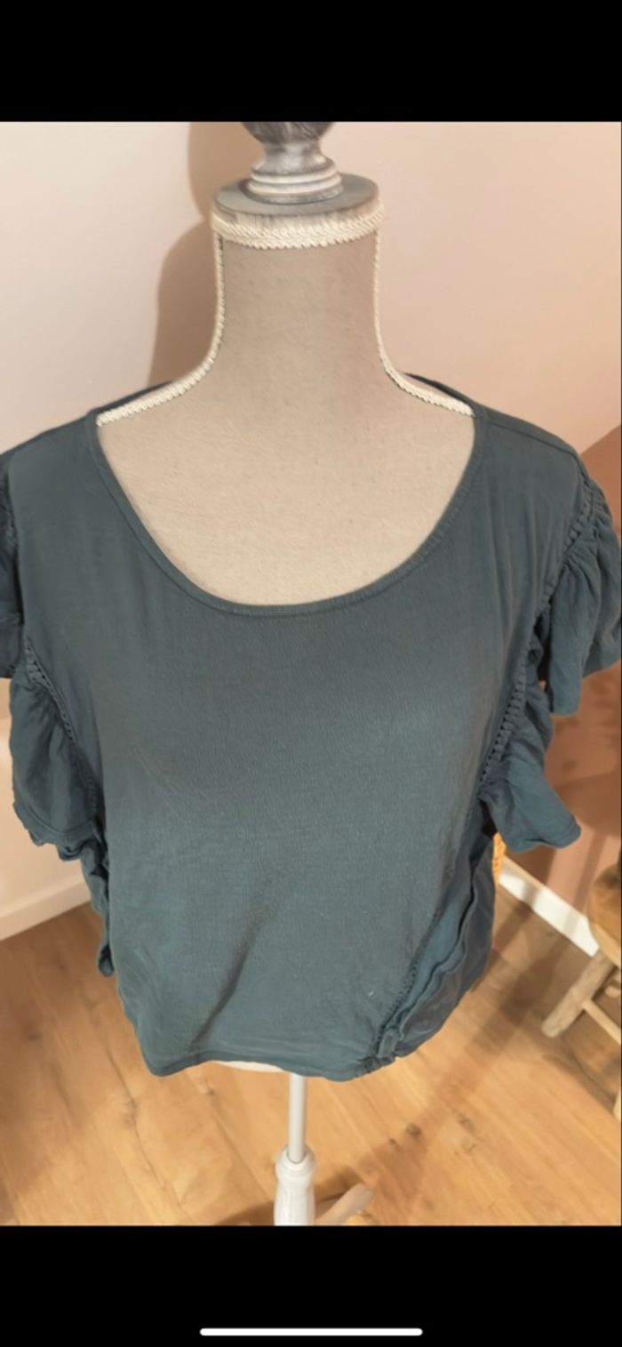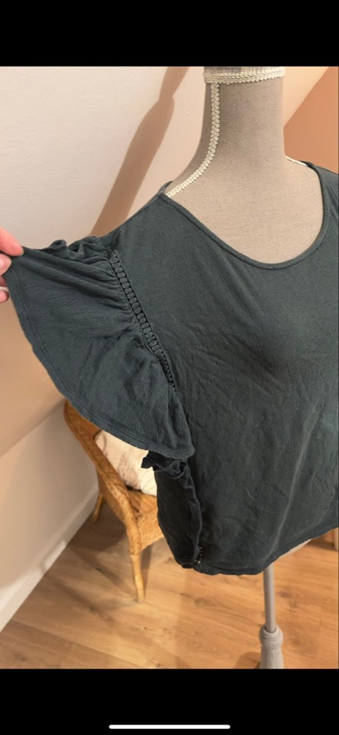 🌿 Blouse sans manches à volant – Vert kaki – Taille L – Très bon état