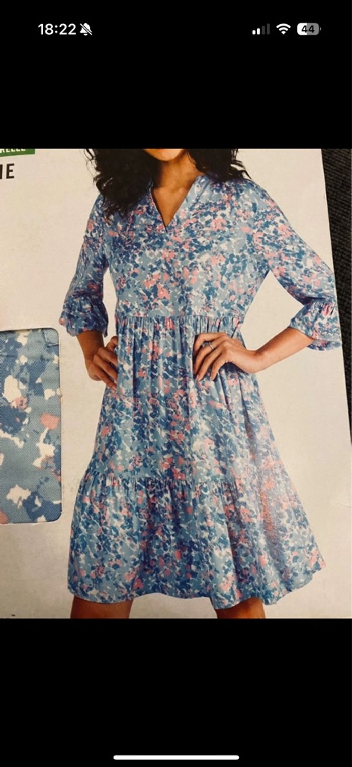 Robe Tunique ESMARA, tendance, confortable et facile à porter. Parfaite pour un look casual ou chic 😍 🧥 Marque : ESMARA 📏 Taille : 42 🌟 État : Neuf 🧵 Matière : 100% viscose 🎨 Couleur : bleu et rose à motif ✅ manche 3/4, volants moderne sur la jupe et au bas de manche