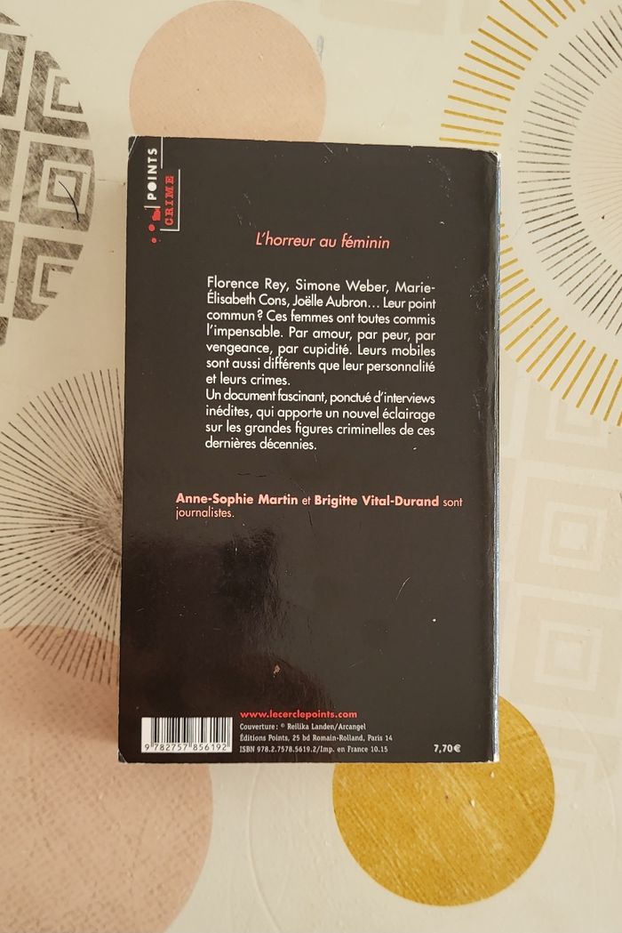 📚Crimes de femmes: 25 histoires vraies Par Anne-Sophie Martin&Brigitte Vital-Durand📚 *ISBN : 9782757856192 *Editeur : Points crime *Etat : BE Résumé : Florence Rey, Simone Weber, Marie-Élisabeth Cons, Joëlle Aubron… Leur point commun ? Ces femmes sont toutes passées à l’acte. Par amour, par peur, par vengeance, par cupidité. Leurs mobiles sont aussi différents que leur personnalité et leurs crimes. Un document fascinant, ponctué d’interviews inédites, qui apporte un nouvel éclairage sur les grandes figures criminelles de ces dernières décennies.... N’hésitez pas à nous contacter