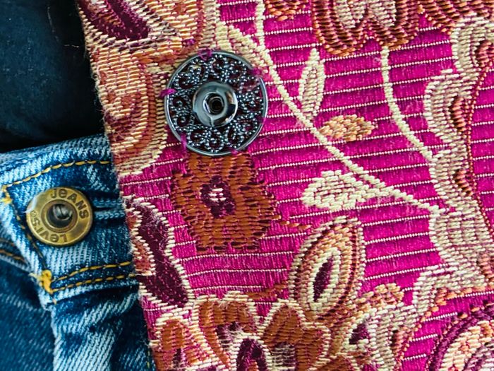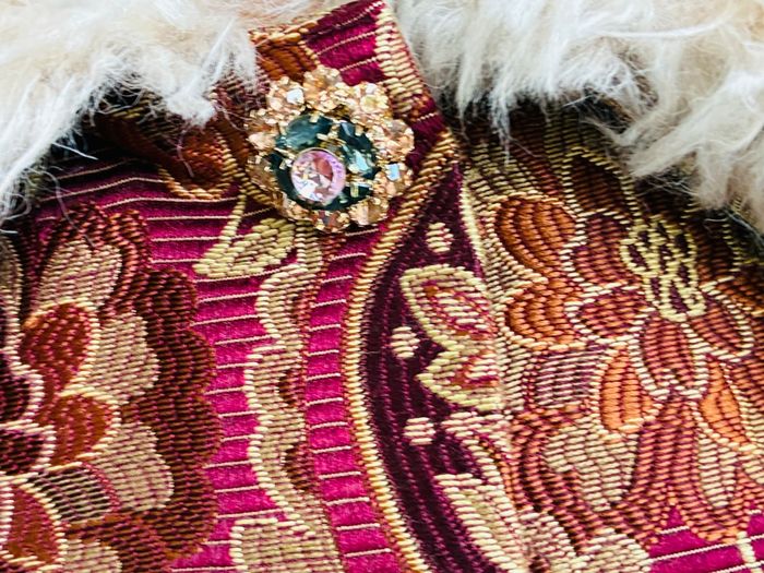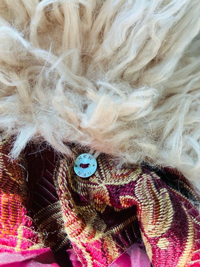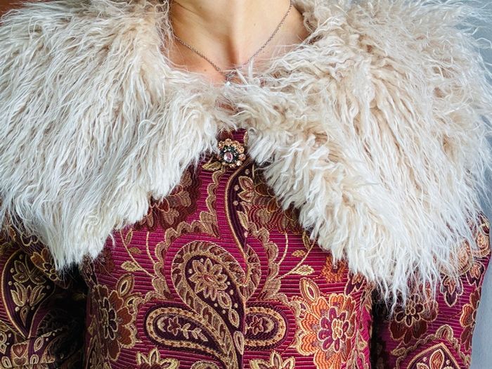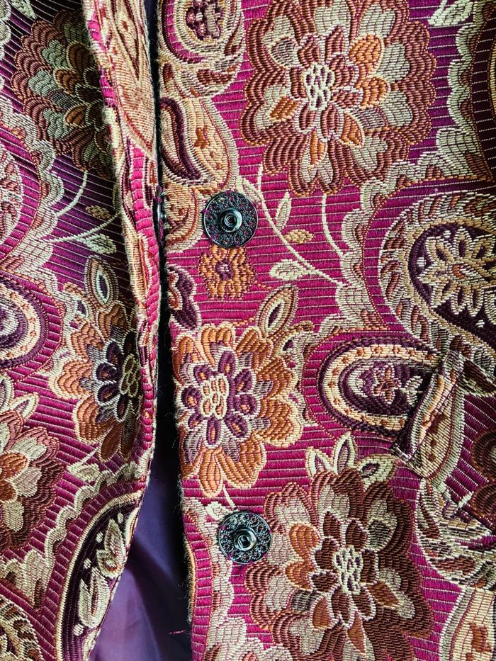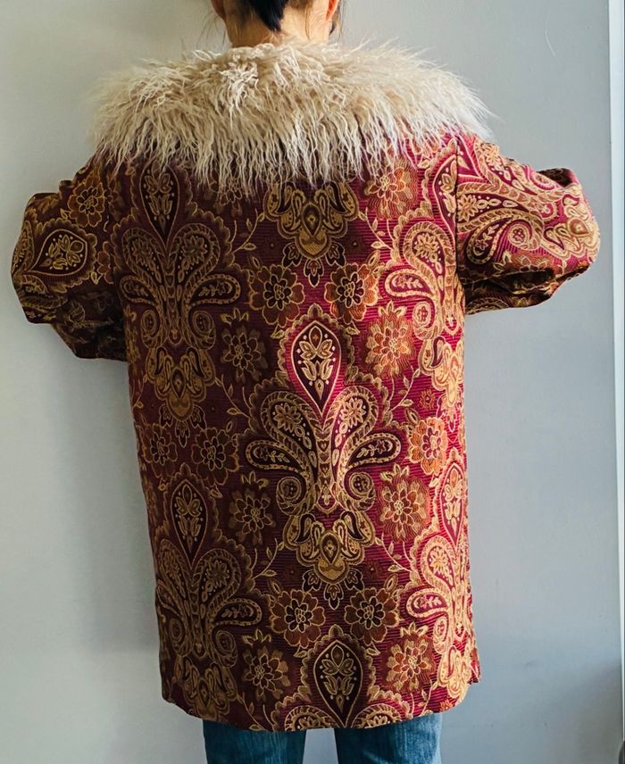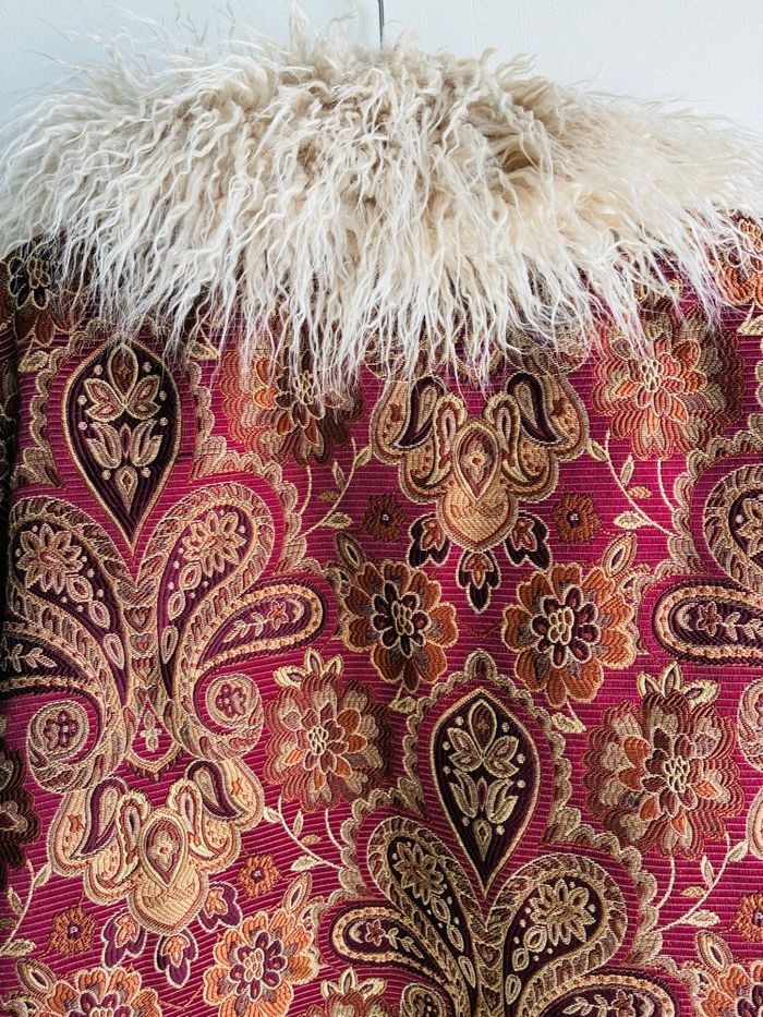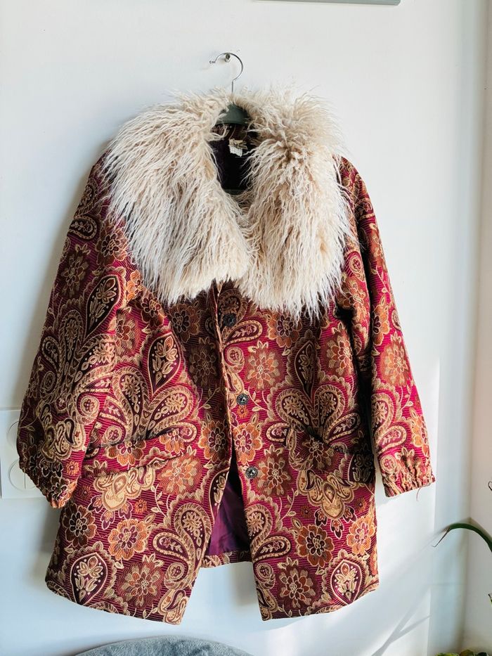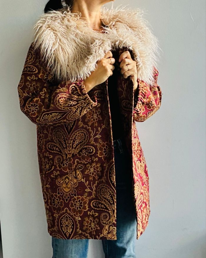 Superbe manteau Bordeaux Tissu brocart / motifs floraux / paisley Avec col fausse fourrure extrêmement douce Possibilité de la retirer (amovible) Style bohème romantique Pièce vintage Plus d’étiquette mais marque NKN Nekane Correspond idéalement à un L Mesures (prises à plat) : * manches (à partir de l’épaule) : 52cm * buste (à partir du haut de l’épaule ) : 81,5cm *largeur épaules : 47cm Poches impeccables non trouées Pièce portée une seule fois et laissée à l’abri de la lumière et de l’humidité : état irréprochable Plus de photos dispo sur simple demande #stefetjuju51femme3638 maison non fumeurs bien d’autres choses dans mon dressing de nouveaux articles très régulièrement nombreux # dans mon profil pour faciliter vos recherches merci pour votre visite et belle journée ☺️ #tapestry #manteau #boheme #chic #faussefourrure #col #vintage #nkn