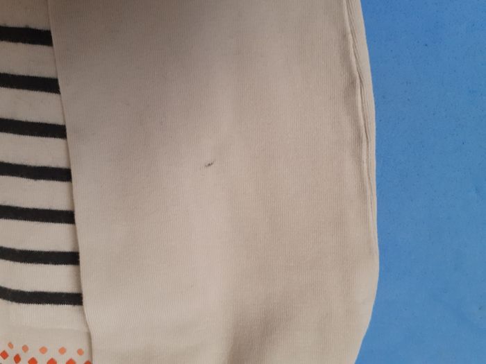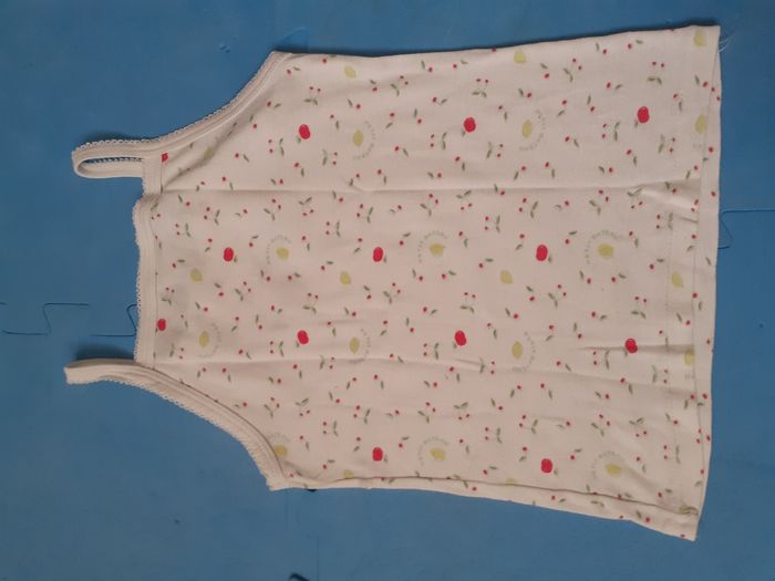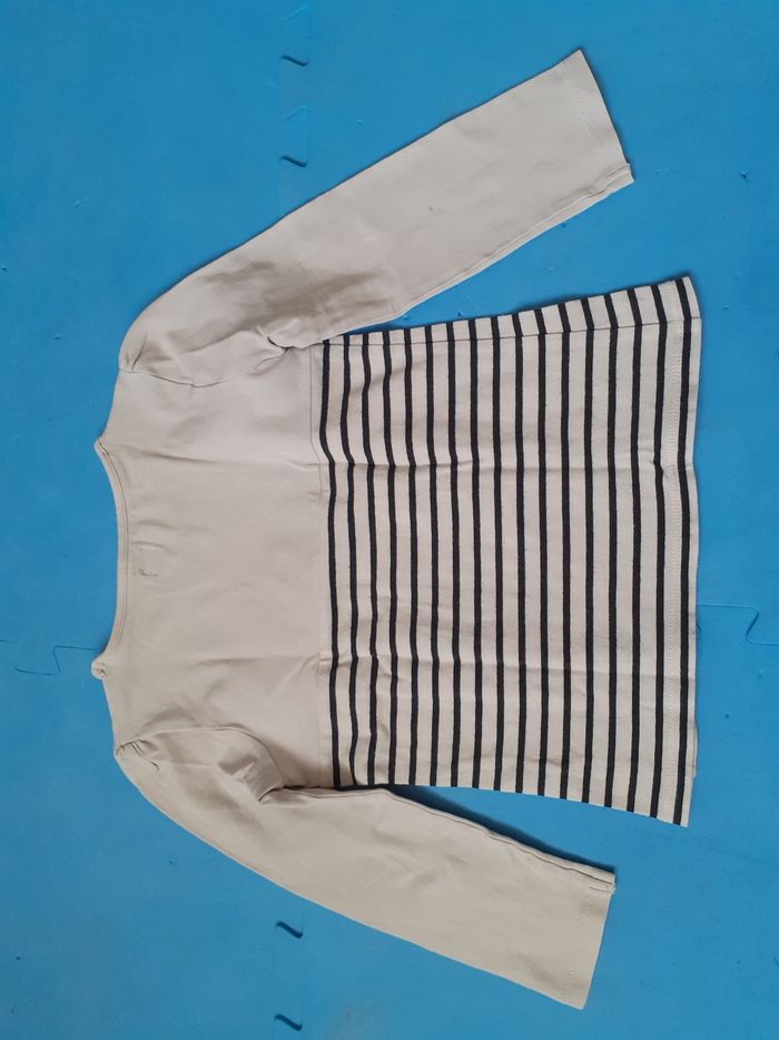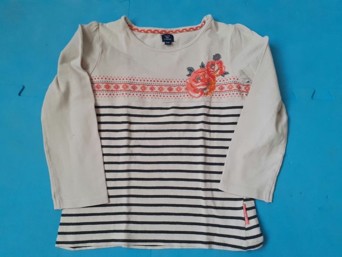 Vends lot de 4 vêtements fille, taille 5 ans. 2 tee-shirts manches longues : 1 de marque Terre de marins (à rayures, petite tache au bras, voir photo), et l'autre de marque Absorba 1 legging de marque Vert Baudet 1 débardeur de marque Petit bateau