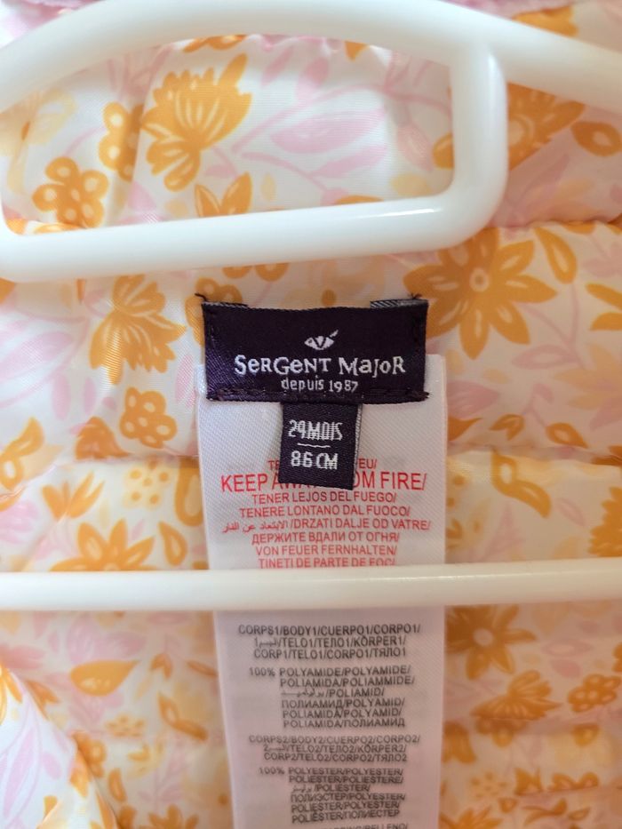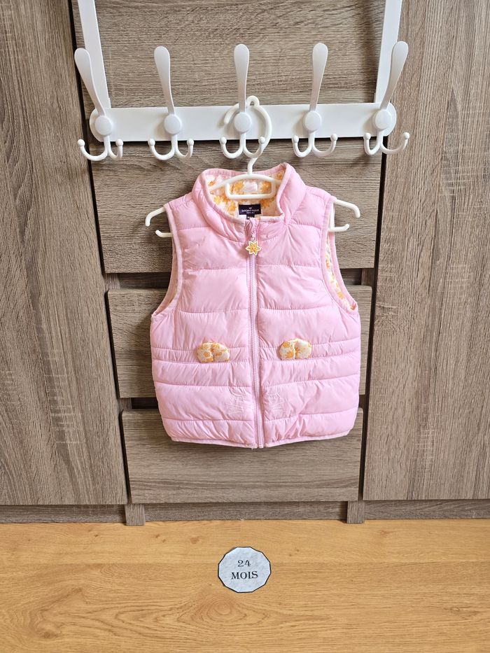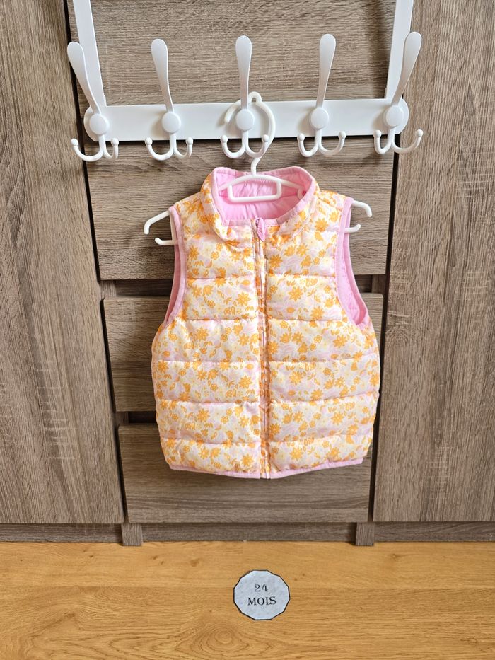 - Doudoune sans manches réversible. 1 face rose et 1 face fleurie jaune et rose.