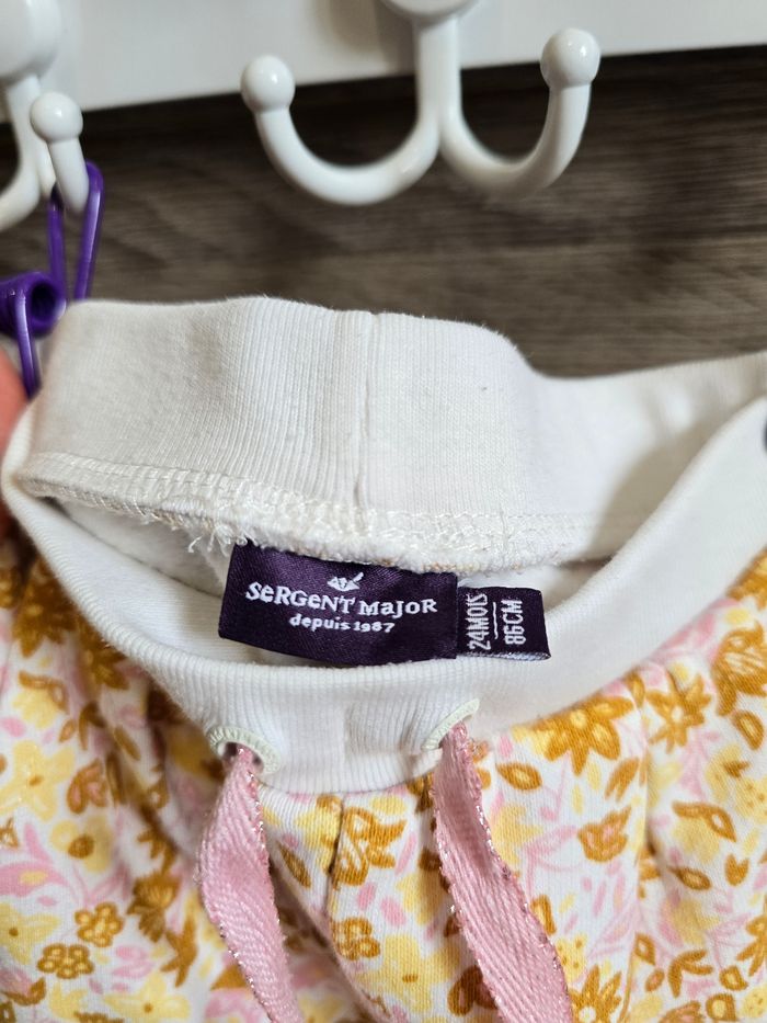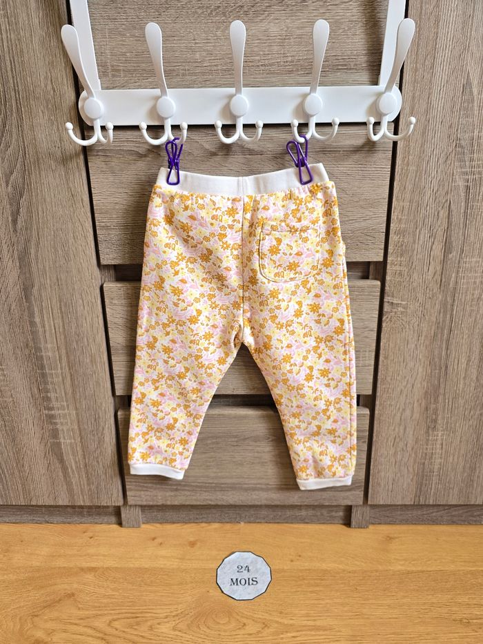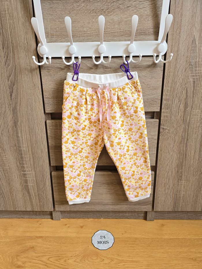 - Pantalon style survêtement motif floral rose clair et jaune.