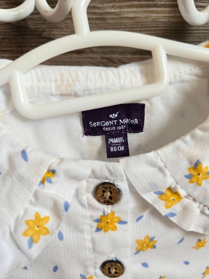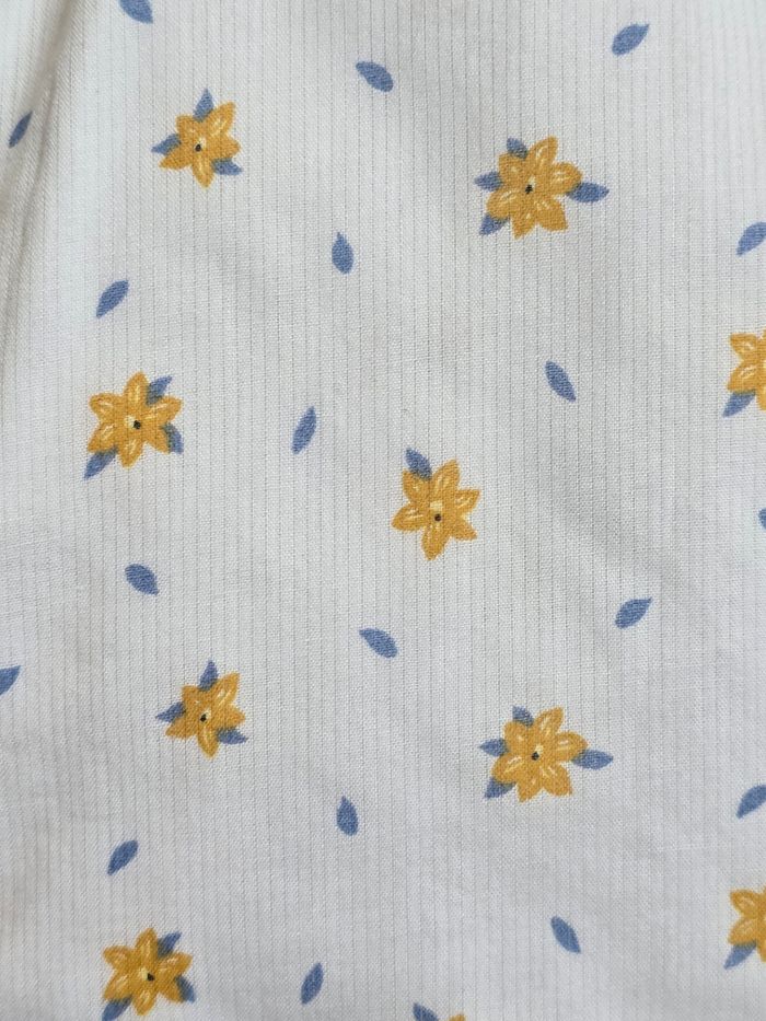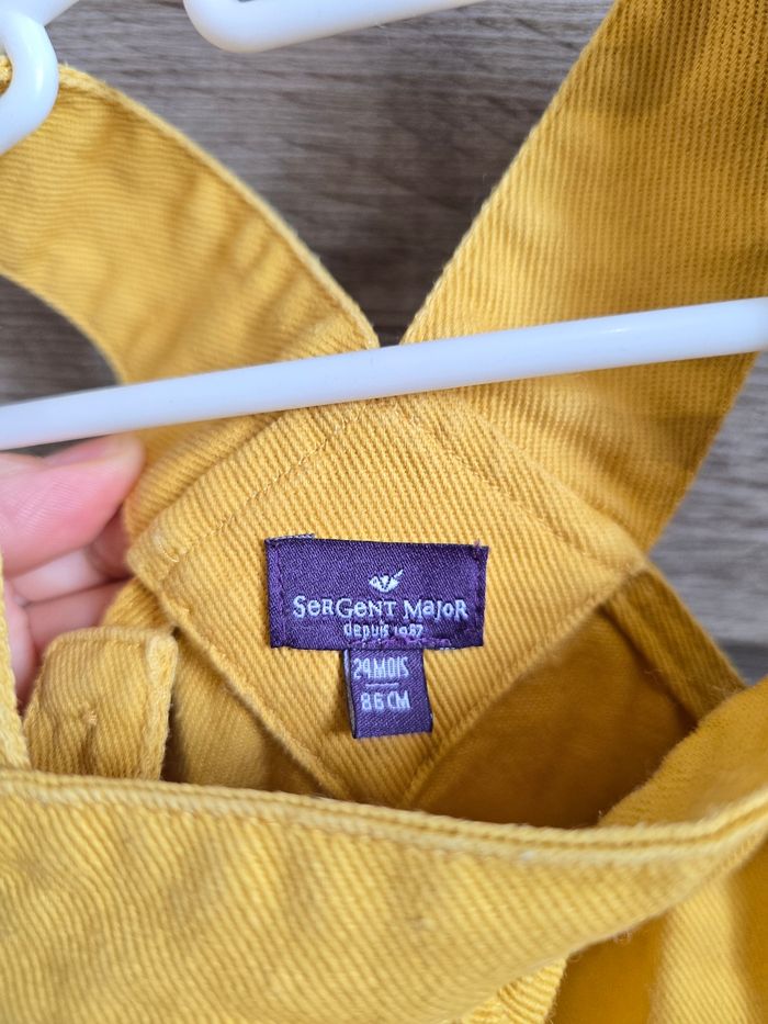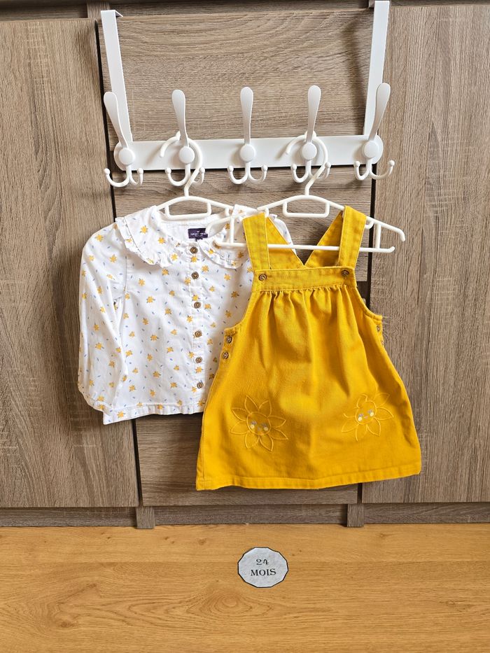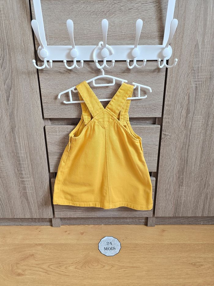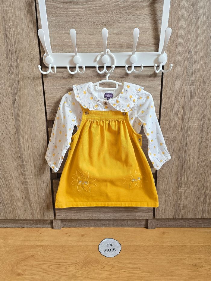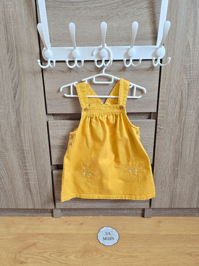- Robe chasuble jaune avec 2 fleurs brodés style tournesols sur le bas.