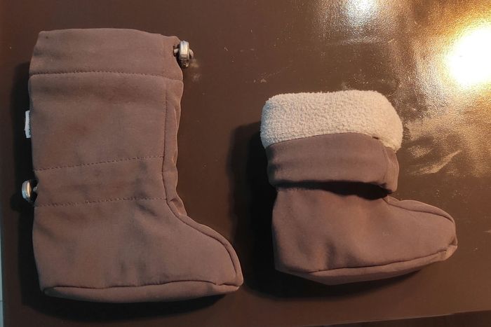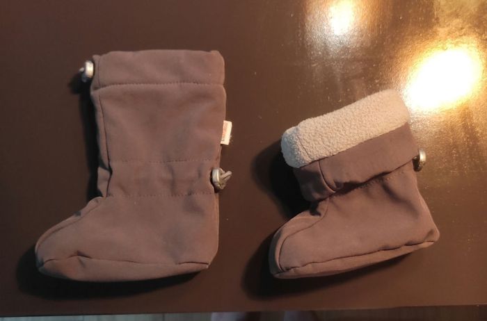 Bottes de portage bébé Évolutives grâce au repli et aux 2 cordons de serrage Bien chaudes avec leur doublure polaire intérieure Deperlantes grâce à l'extérieur en softshell Excellent état