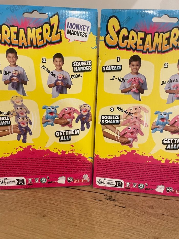 Je vends deux peluches Screamerz de la marque Simba, modèles Monkey Madness (violet) et Pink Bunny (rose).