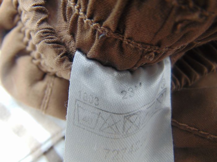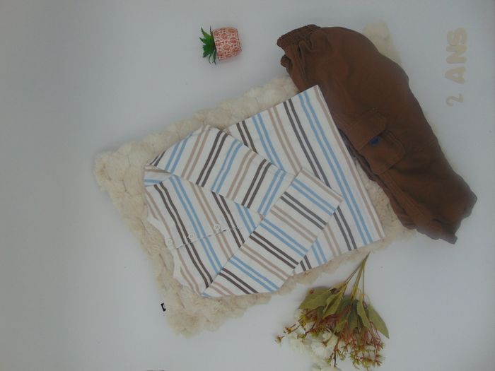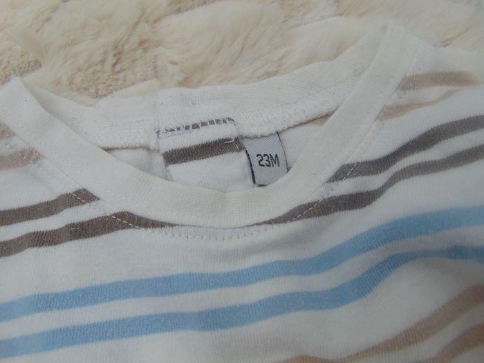 - Tee-shirt manches longues et pantalon - Tee-shirt couleur blanc à rayures bleues et marrons - Fermeture dans le dos avec boutons - Pantalon couleur marron - Taille élastique - Aucune tâche ni trou