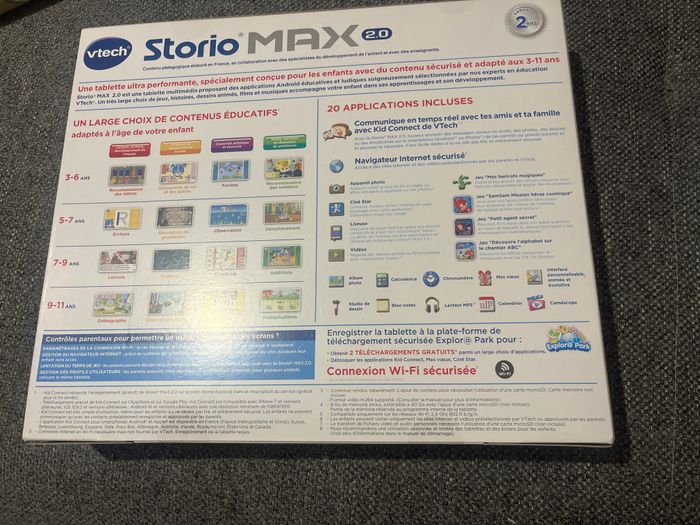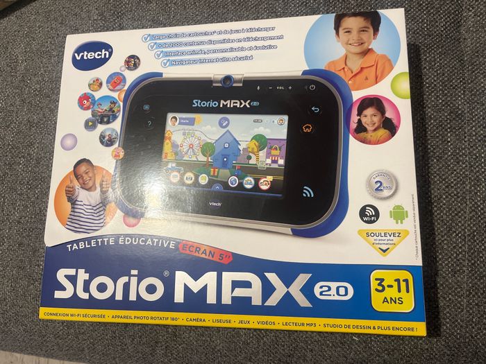 Je vends cette tablette enfants tactile, éducative et sécurisée avec écran couleur 5 pouces. Il s'agit de la Storio Max 2.0 de la marque Vtech, elle est neuve et n'a jamais été ouverte.