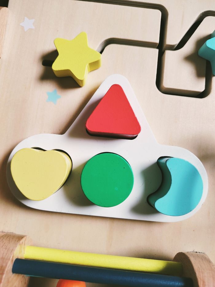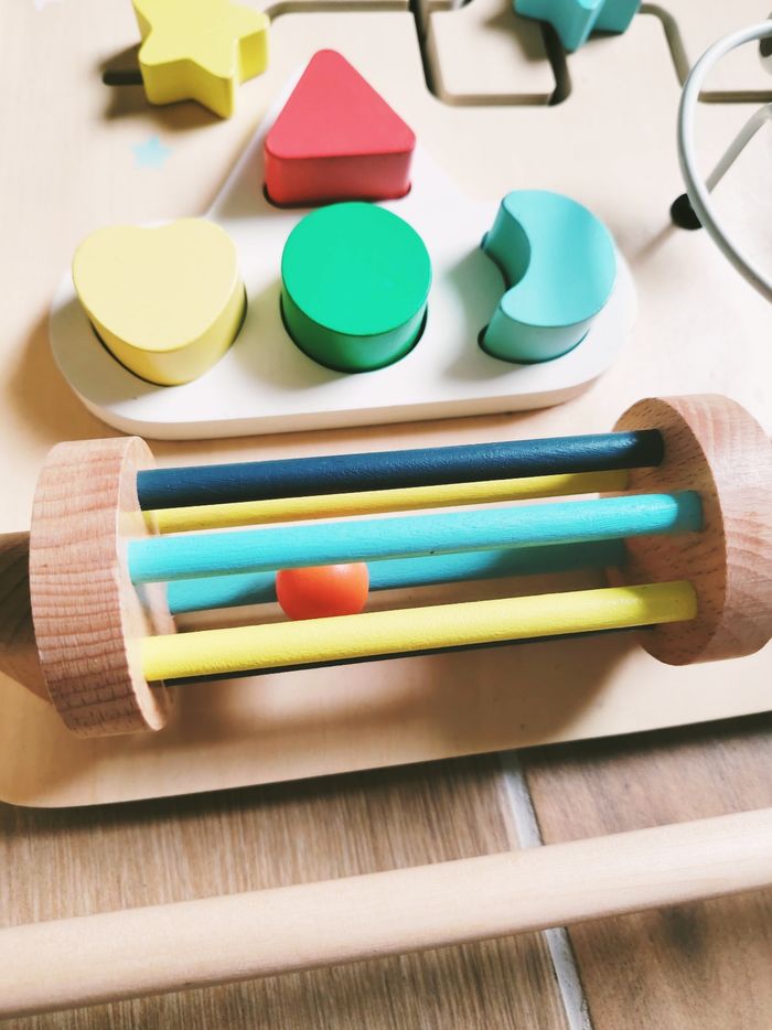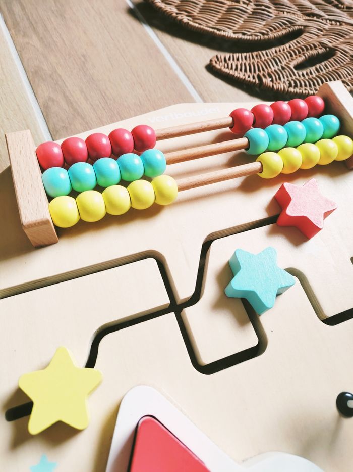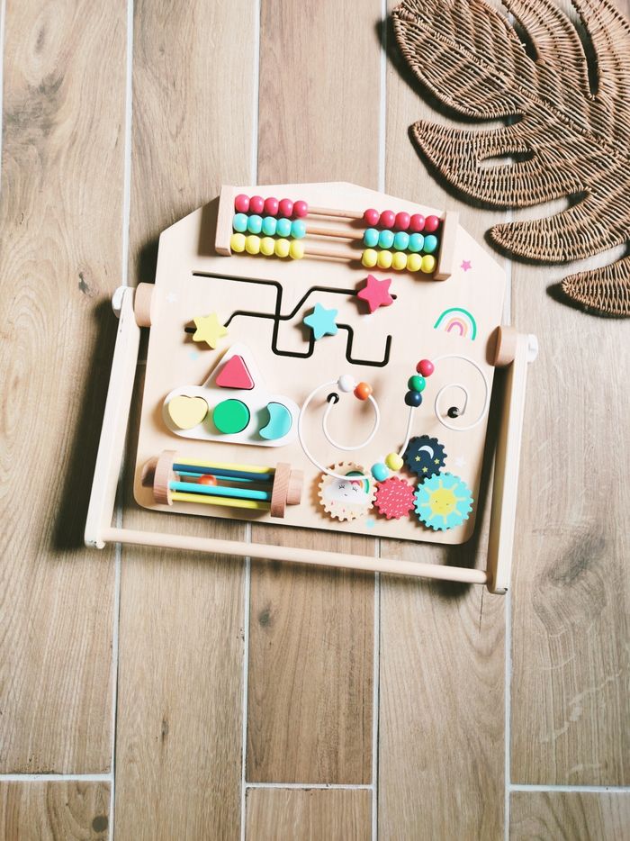 🌞Planche-panneau multi activités busy board en bois marque Vertbaudet JB1879 🎀Ce panneau d'activités en bois offre de nombreuses activités pour éveiller les sens de votre bébé et développer sa motricité fine. ✨Un boulier en métal avec perles en bois ✨Des engrenages en formes de soleil ✨Un labyrinthe avec des etoiles ✨4 formes à encastrer ✨Un cylindre rouleau à faire tourner avec clochette à l'intérieur 🎀 Munie d'une barre réglable à l'arrière pour choisir l'inclinaison souhaitée. ❇️N'hésitez pas à créer un lot pour économiser sur les frais de port❇️ Premier âge, Jouet bébé, Jouet d'activité, Jouet ludique, Jouet eveil, Mémorisation, Memoire, aptitude, motricité, jeu Adresse, Montessori, jeu bois, Jouet bois, Jouet vintage, Jeu adresse, jeu apprentissage, dextérité, jeu sensorielle, jeu educatif, activités et Jouet pour bébé, trier empiler, encastrer, jeux et jouets