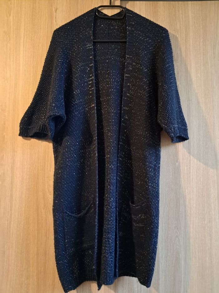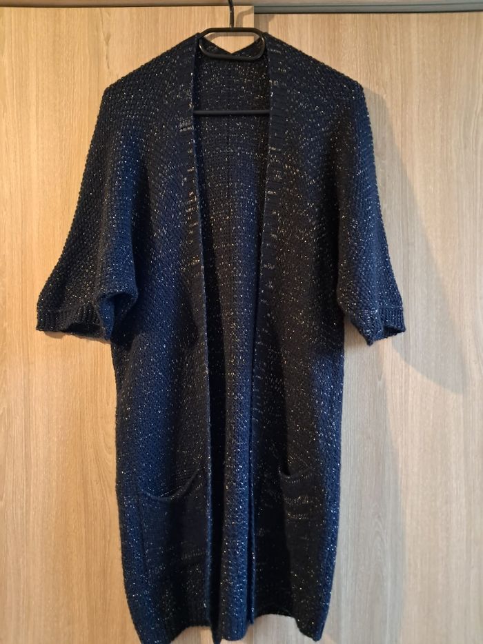 Gilet marine avec des brillants. 90 % acrylique et 10 % laine. Longueur 81 cm. 2 poches. Taille M. Cornelius