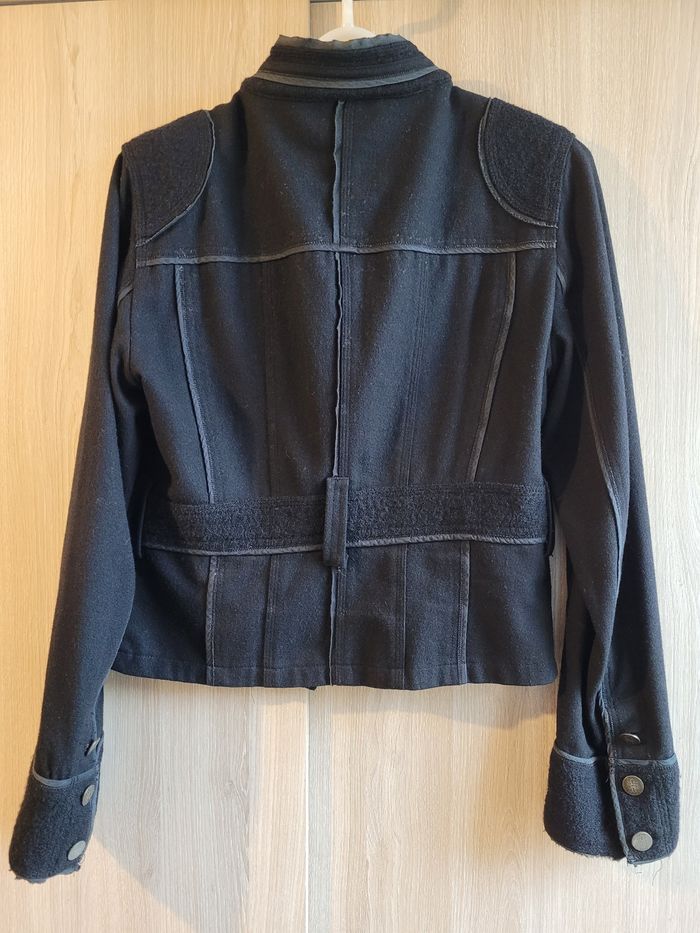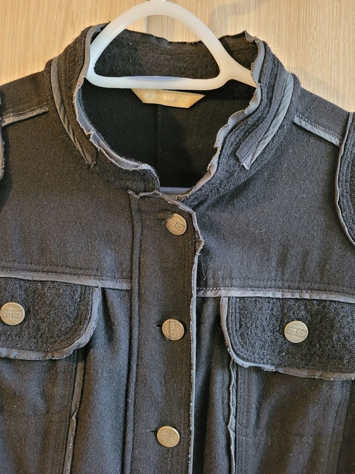 Veste noire 60 % laine et 40 % viscose. Longueur 54 cm. 4 poches extérieures. Photos jointes des poignets montrant des signes d'usure. Taille XL. PROMOD