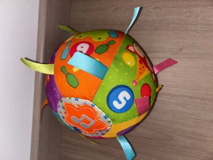 Ce jouet interactif et musical, en forme de ballon, est équipé d'un détecteur de mouvement qui déclenchechansons et sons amusants dès qu'on la lance ou la fait rouler. La légèreté de la balle permet à votre bébé de jouerfacilement et de construire sa motricité pendant des heures de jeu. Ce jeu électronique éducatif possède également d'un bouton pour déclencher des apprentissages sur les animaux et les premiers chiffres, mais également des chansons et mélodies. 6 faces pour apprendre les chiffres avec les P'tits copains du cirque.  Le jouet musical dispose au total de 15 mélodies et 5 chansons. Fonctionne avec 2 piles Lavable en machine (module électroniquedétachable).