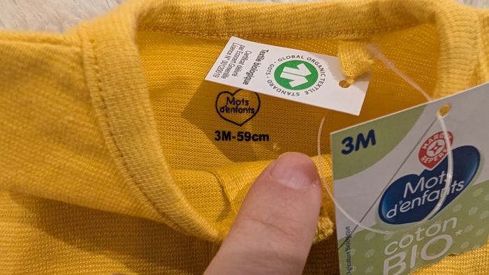 Je vends ce t-shirt manches courtes de la marque Mots d'Enfants taille 3 mois. Il est neuf avec étiquette.