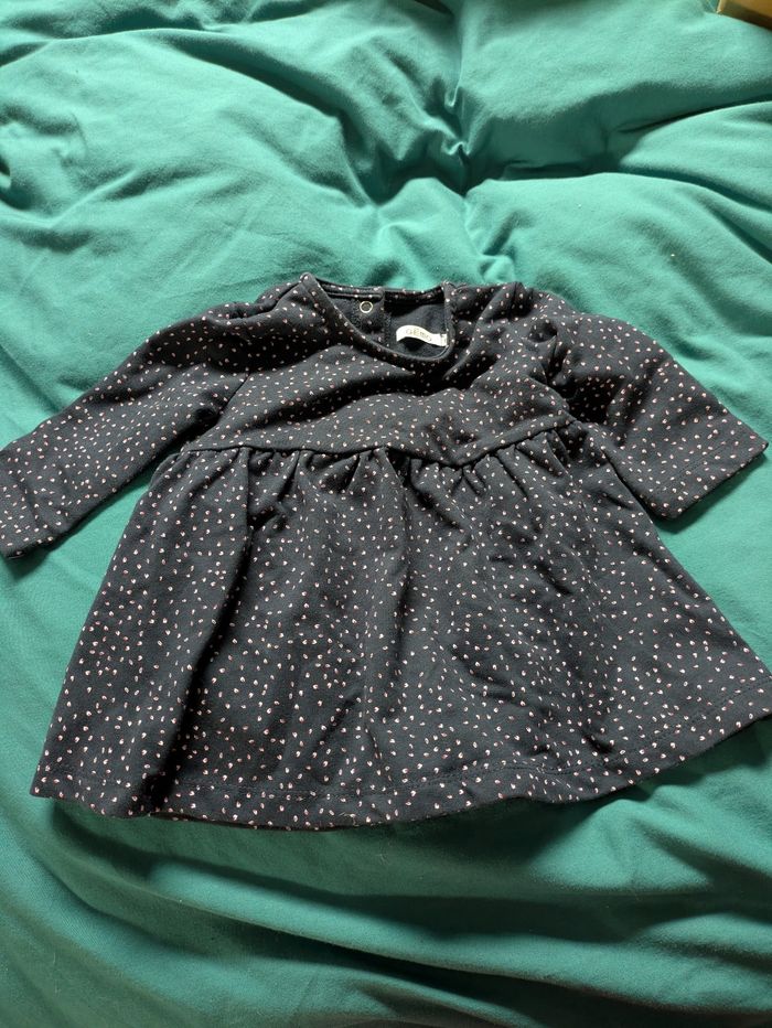 Une robe bleu marine Gemo à motifs blancs et roses en très bon état 6 mois.