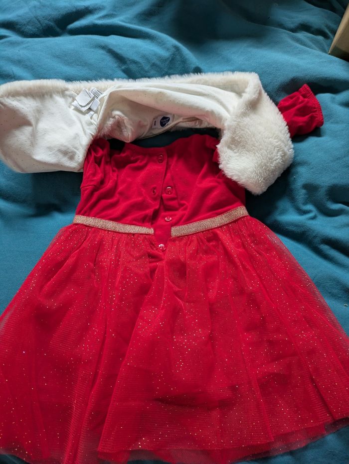 Une robe de fête de fin d'année avec un gilet indépendant en moumoute blanche en excellent état marque mots d'enfants.