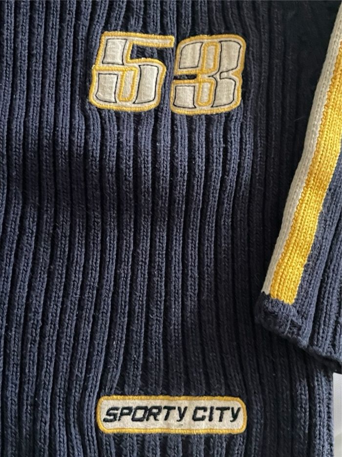 Sweat bleu marine à col V, avec bandes jaunes et blanches sur les manches et le bas.