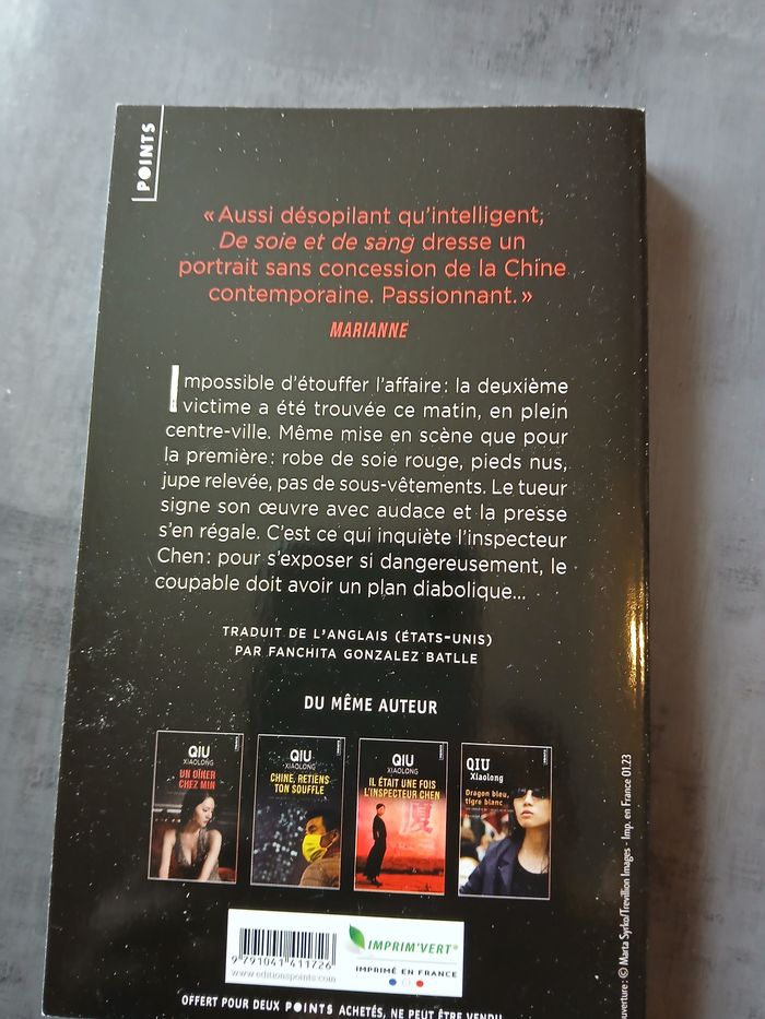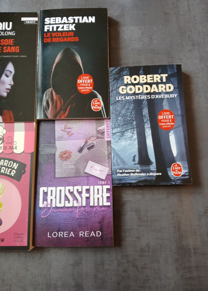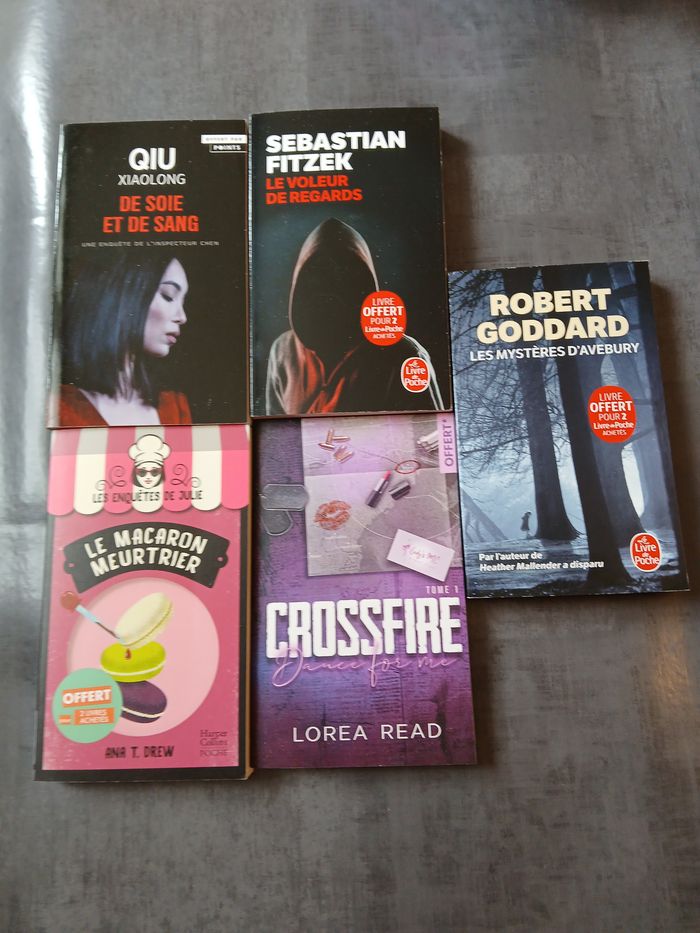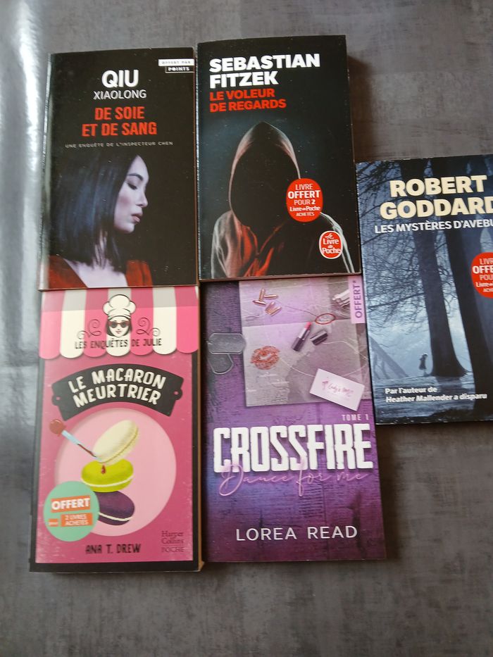 livre de soie et de sang (qui xialong),le voleur de regards (sebastian fitzek),le macaron meurtrier (les enquetes de julie),crssfire 1 (lorea read,les mysteres d'avebury (robert goddard)