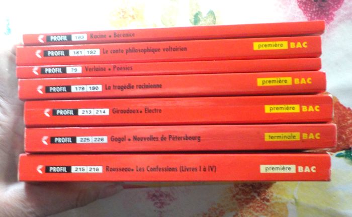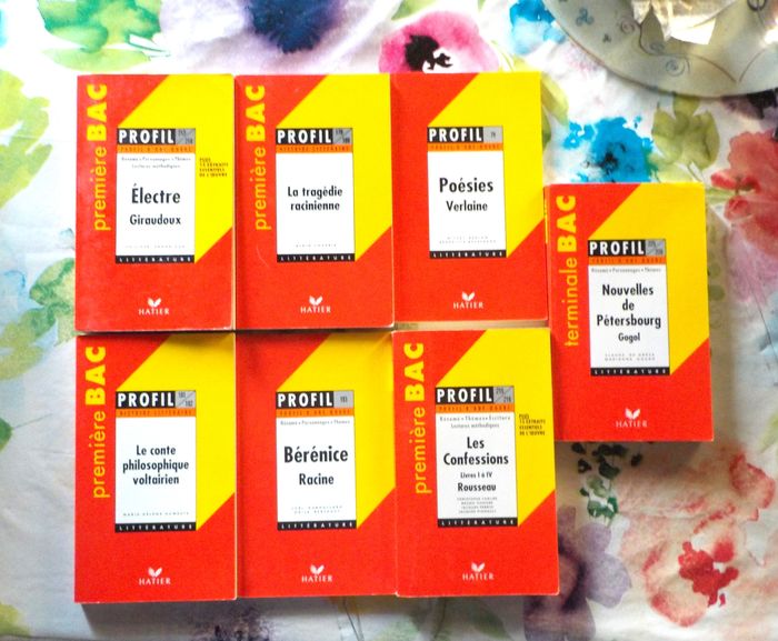 7 PROFIL HATIER Bon état ELECTRE GIRAUDOUX Profil Première Bac LA TRAGEDIE RACINENNE Profil Première Bac POESIES VERLAINE Profil LE CONTE PHILOSOPHIQUE VOLTAIRIEN Profil Première Bac BERENICE RACINE Profil LES CONFESSIONS Livres I à IV ROUSSEAU Profil Première Bac NOUVELLES DE PETERSBOURG GOGOL Profil