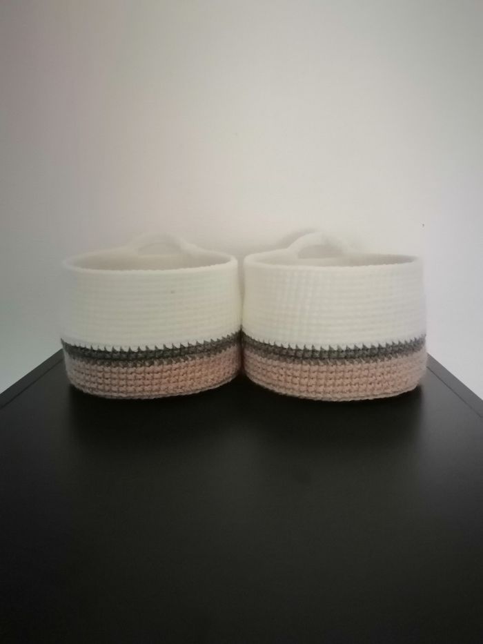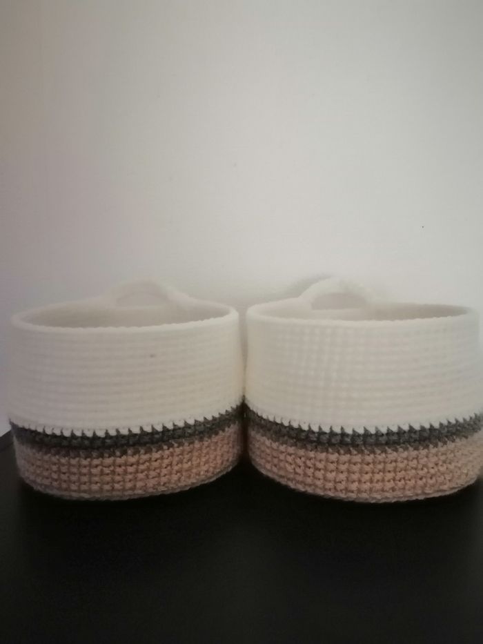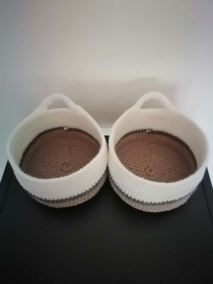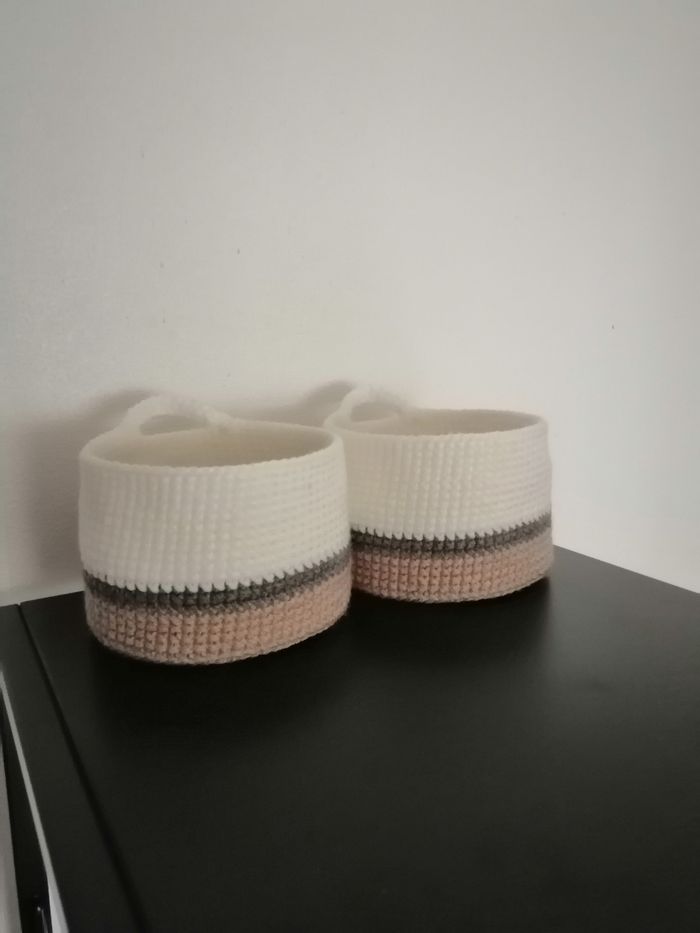 2 petits paniers rond en laine et acrylique de couleur beige, gris foncé et blanc. Dimensions 13cm de largeur x 9 cm de hauteur. Matière assez souple. Fait au crochet. Peut être lavé en machine et repassé. Bon état jamais utilisé.