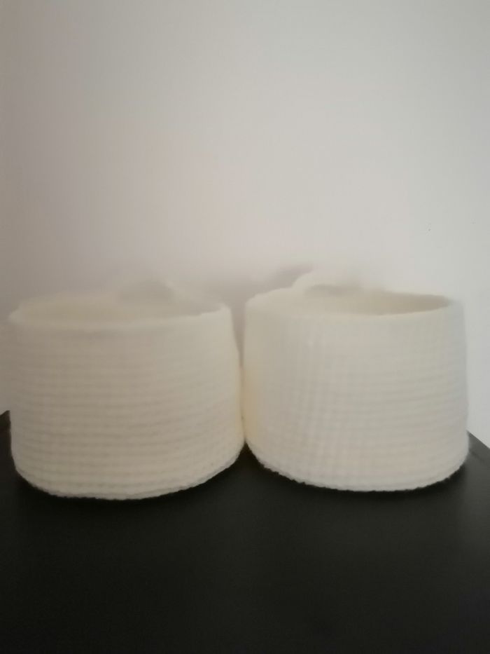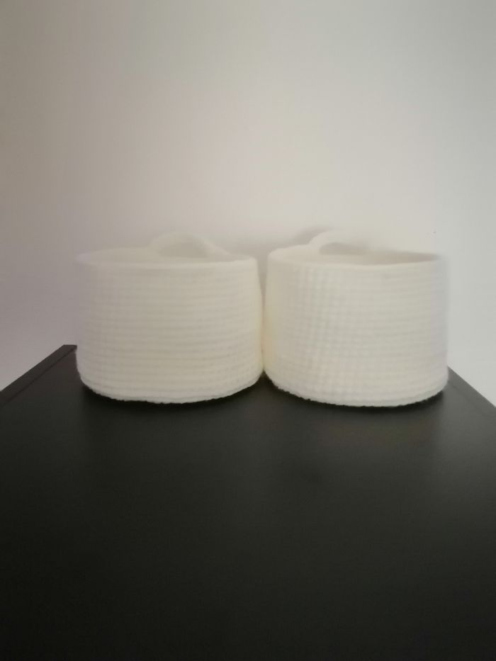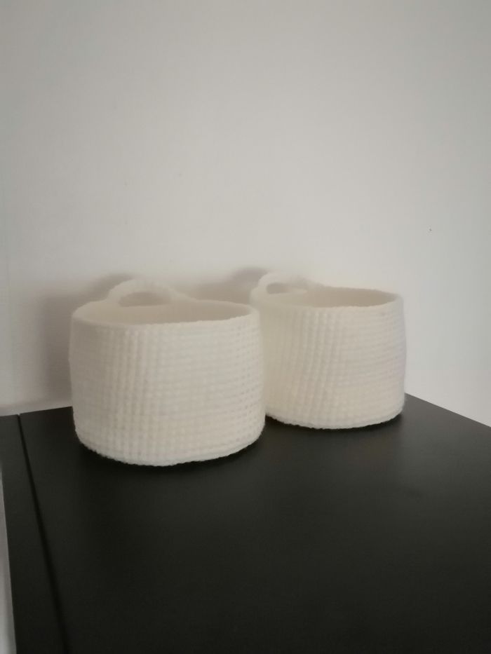 2 petits paniers rond en laine et acrylique de couleur blanc. Dimensions 13cm de largeur x 9 cm de hauteur. Matière assez souple. Fait au crochet. Peut être lavé en machine et repassé. Bon état jamais utilisé.